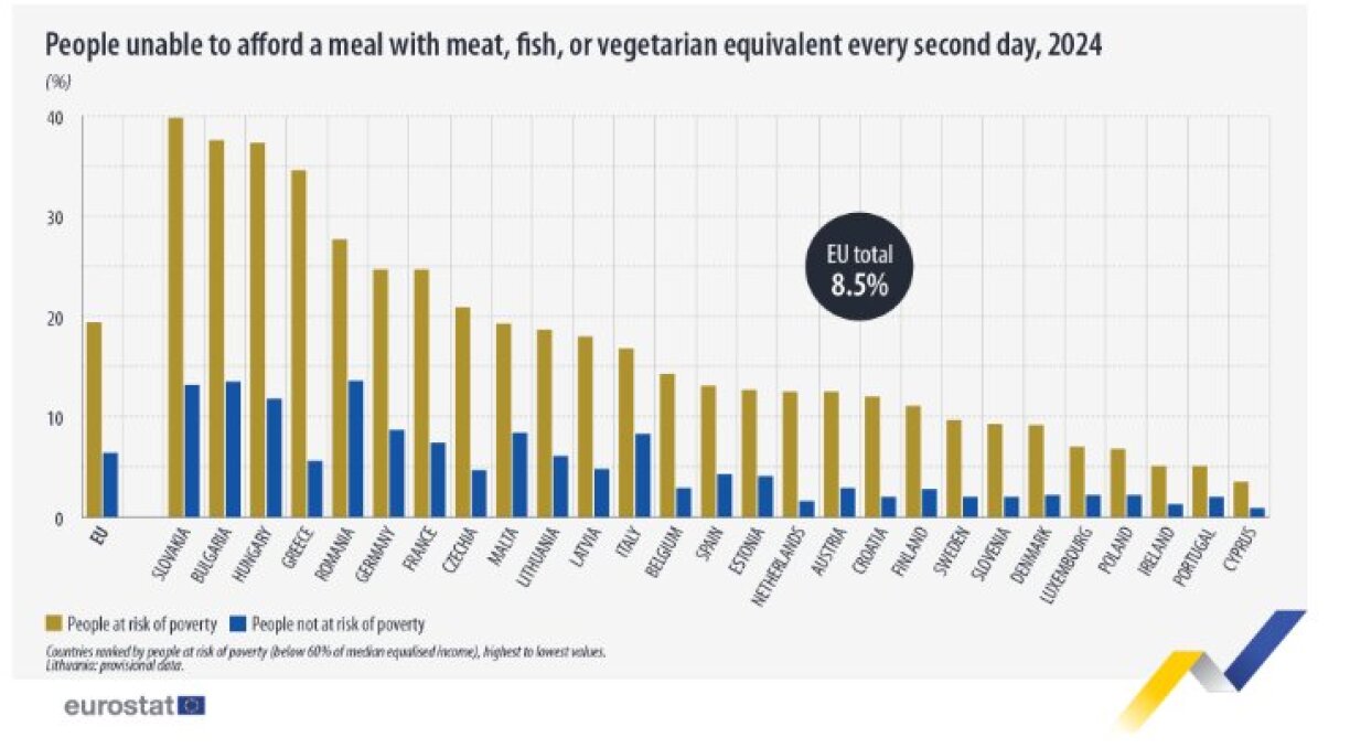 Au niveau européen, 8,5 % de la population a déclaré en 2024 qu’elle ne pouvait pas se permettre un repas contenant de la viande, du poisson ou un équivalent végétarien tous les deux jours – contre 9,5 % en 2023 selon les derniers chiffres d’Eurostat. La situation s’améliore donc.