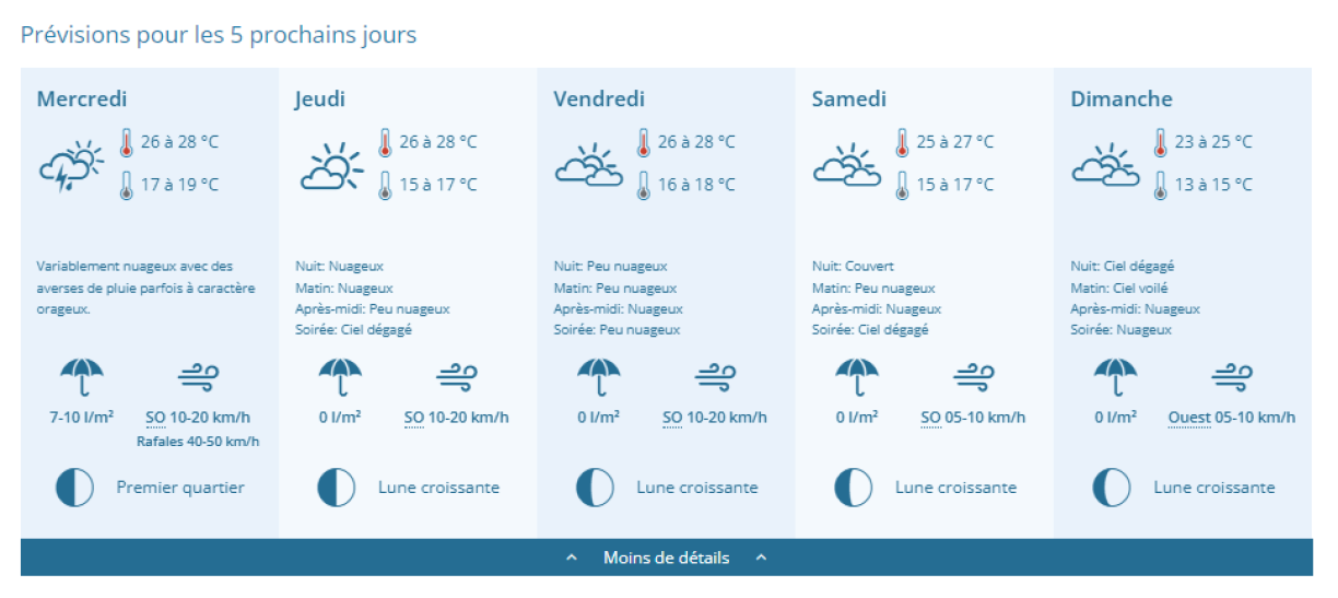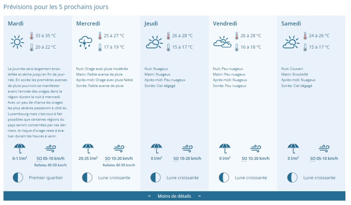 Le temps finira par se calmer dès jeudi, avec des températures qui deviendront plus supportables, et un ciel peu voire pas nuageux jusqu'à la fin de la semaine.