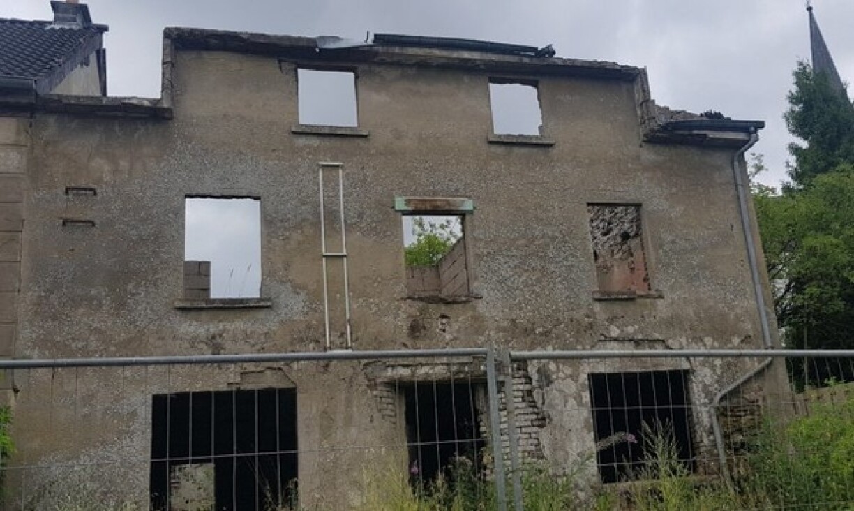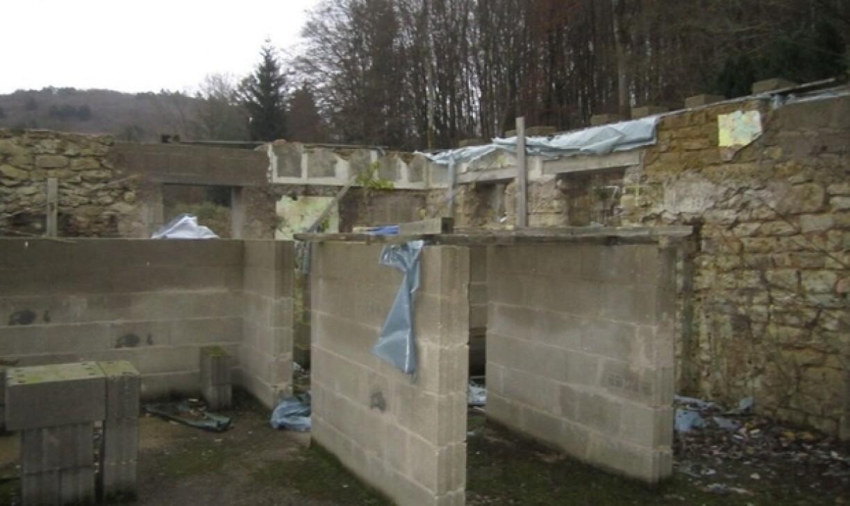 Il s'agit encore d'une maison jumelée, à 375 000 euros, mais cette fois-ci le terrain est conséquent, avec 41 ares, divisés en "place occupée", en terre labourable et en pré. Le cadre a l'air encore plus sauvage, avec la belle nature du Mullerthal tout autour... Mais côté maison, il ne reste que les murs, qui ne dépassent pas un étage. Il va falloir se retrousser les manches!