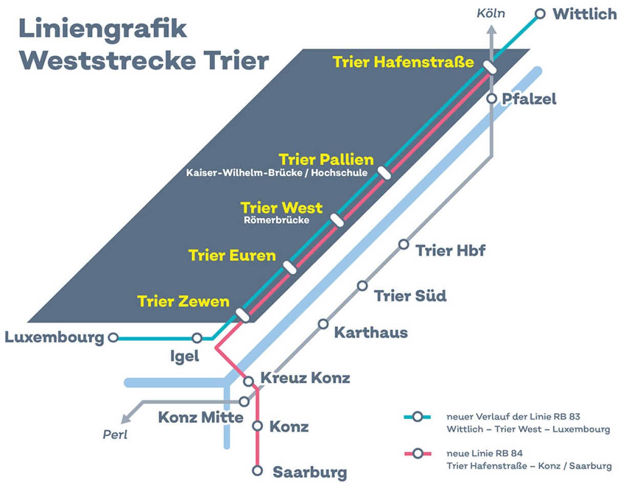À l'avenir, des trains de voyageurs circuleront deux fois par heure entre Wittlich et Luxembourg-Gare ainsi qu'entre Schweich et Sarrebourg. La ville de Trèves sera ainsi mieux connectée au Luxembourg. Jusqu'à présent, la ligne entre Wittlich et Luxembourg n'était ouverte qu'au trafic de marchandises.