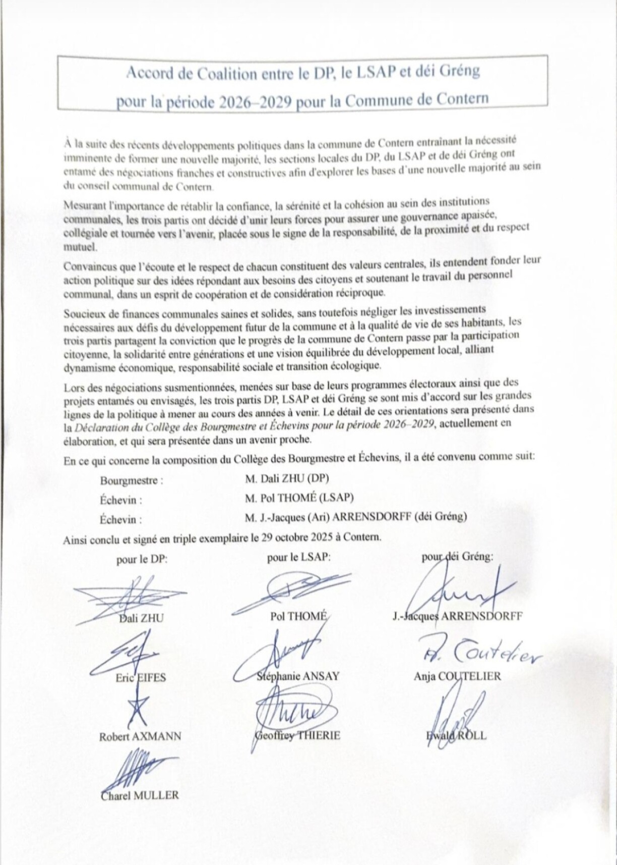 Il s’agit de la première coalition DP-LSAP-Gréng au niveau local. Le conseiller communal DP Dali Zhu devient bourgmestre. Il sera assisté du premier échevin Pol Thomé (LSAP) et du second échevin Ari Arrensdorff (déi Gréng).