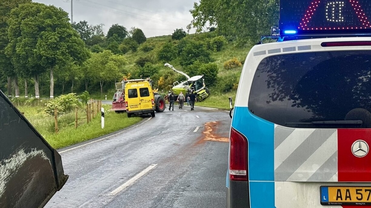 Lorsque que le photographe de RTL est arrivé sur place, l’engin agricole avait été relevé, mais la route était toujours barrée. Les services du CGDIS ont dû recourir à un produit spécial après qu’un liquide se soit répandu sur la chaussée.