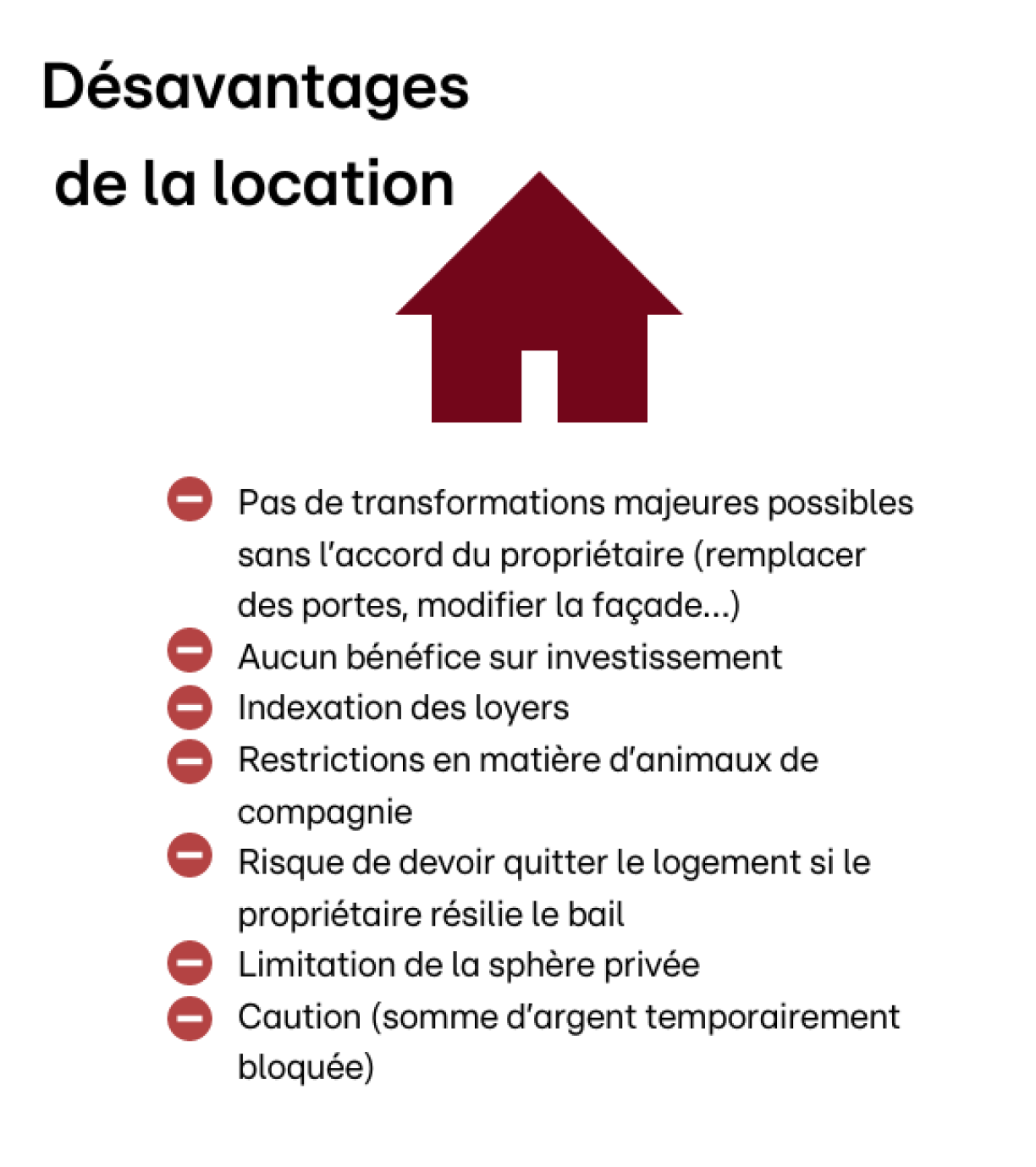 Si vous louez une maison ou un appartement, la charge financière est peut-être moindre. En revanche il vous faudra vivre au quotidien avec certaines contraintes et restrictions. Voici quelques avantages et inconvénients de la location.