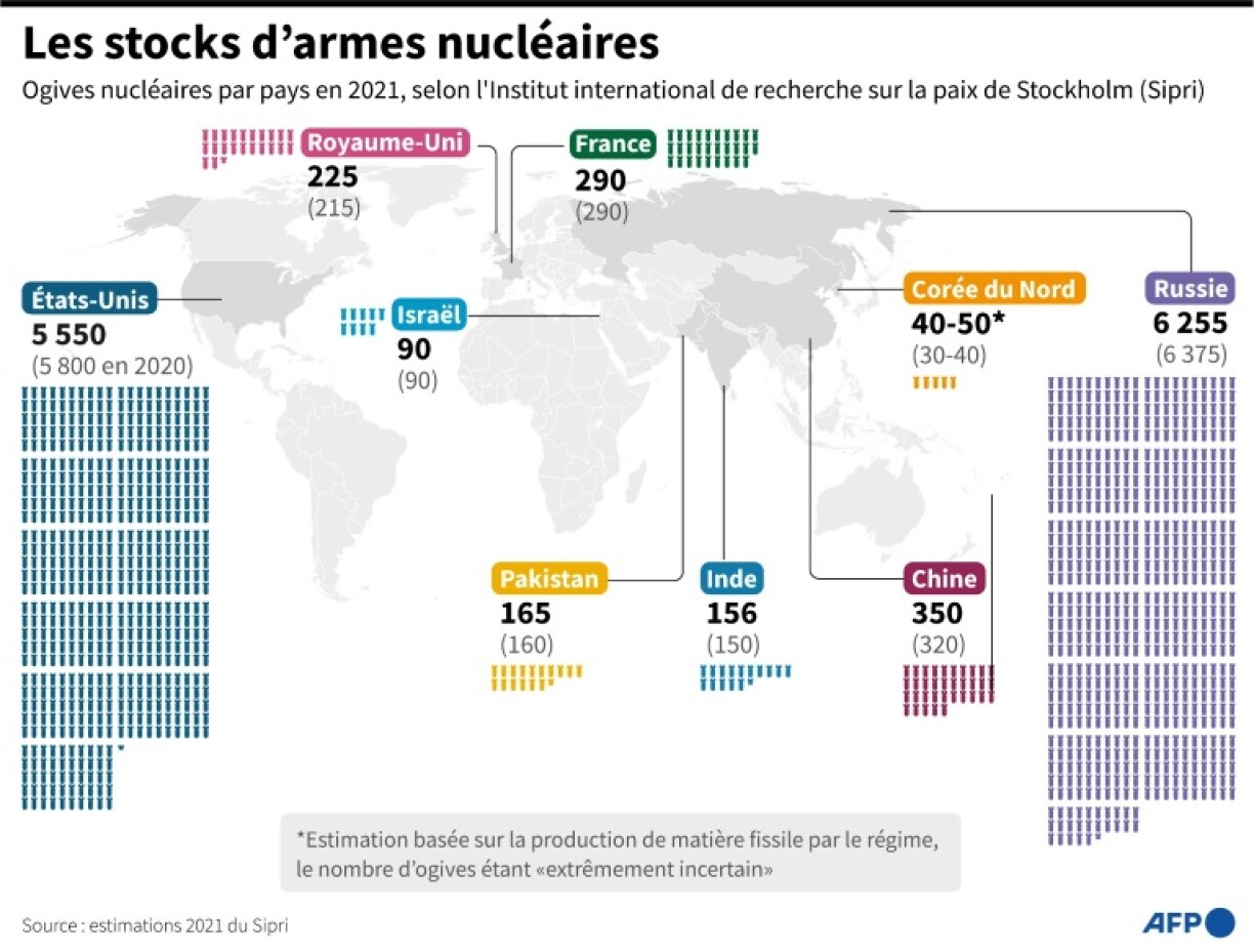 “Elles peuvent être déclenchées dans les 10 minutes”, explique à l’AFP Marc Finaud, expert en prolifération au Centre Politique de Sécurité de Genève (GCSP). “Soit ce sont des ogives déjà fixées sur des missiles, soit ce sont des bombes déjà à bord” des bombardiers et sous-marins.