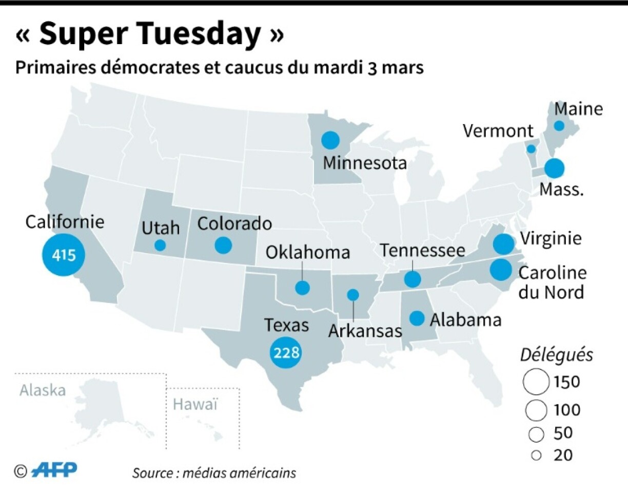 Après un goutte-à-goutte de scrutins, les primaires démocrates prennent une toute autre ampleur mardi avec l’avalanche de votes du “Super Tuesday”, qui pourrait avoir un impact décisif sur la course pour désigner le rival du président républicain Donald Trump en novembre.