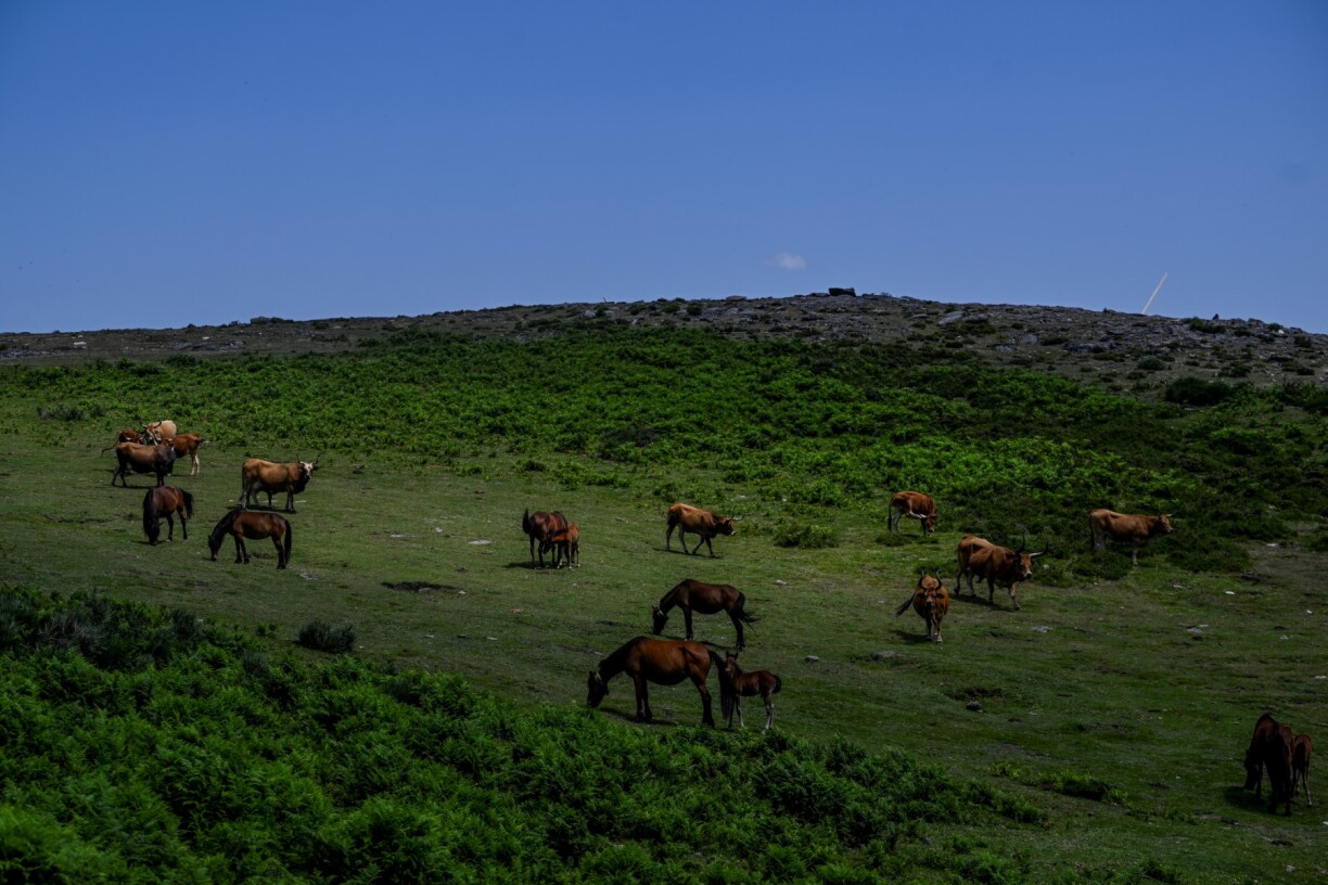 Bruyères, genêts, herbes sauvages: les “garranos”, qui recherchent aux heures de plus forte chaleur l’ombre des rochers et des immenses éoliennes plantées au sommet des montagnes, dévorent chacun une trentaine de kilos de végétation par jour.