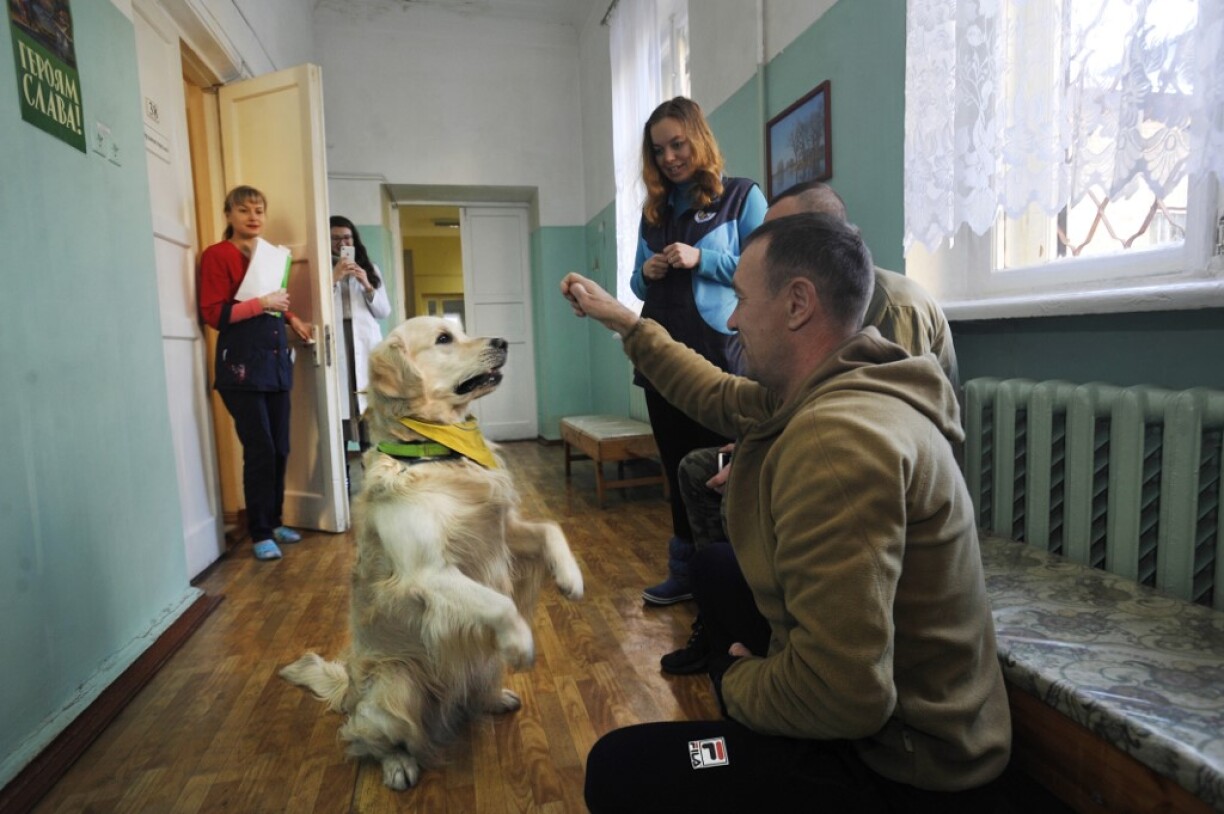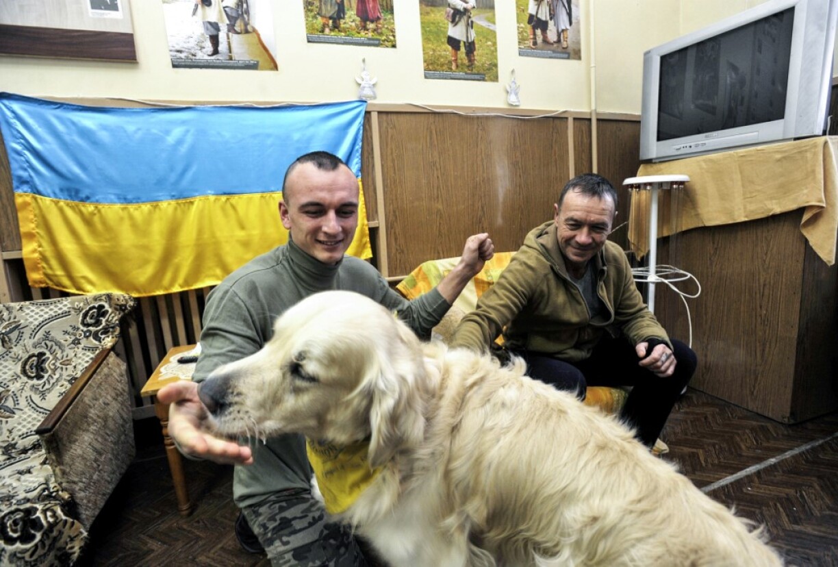 Le golden retriever pose d’abord sa tête sur les genoux du soldat, puis ses pattes sur ses épaules: l’Ukraine, où la guerre avec les séparatistes prorusses continue, utilise des chiens pour aider les combattants à surmonter le stress post-traumatique.