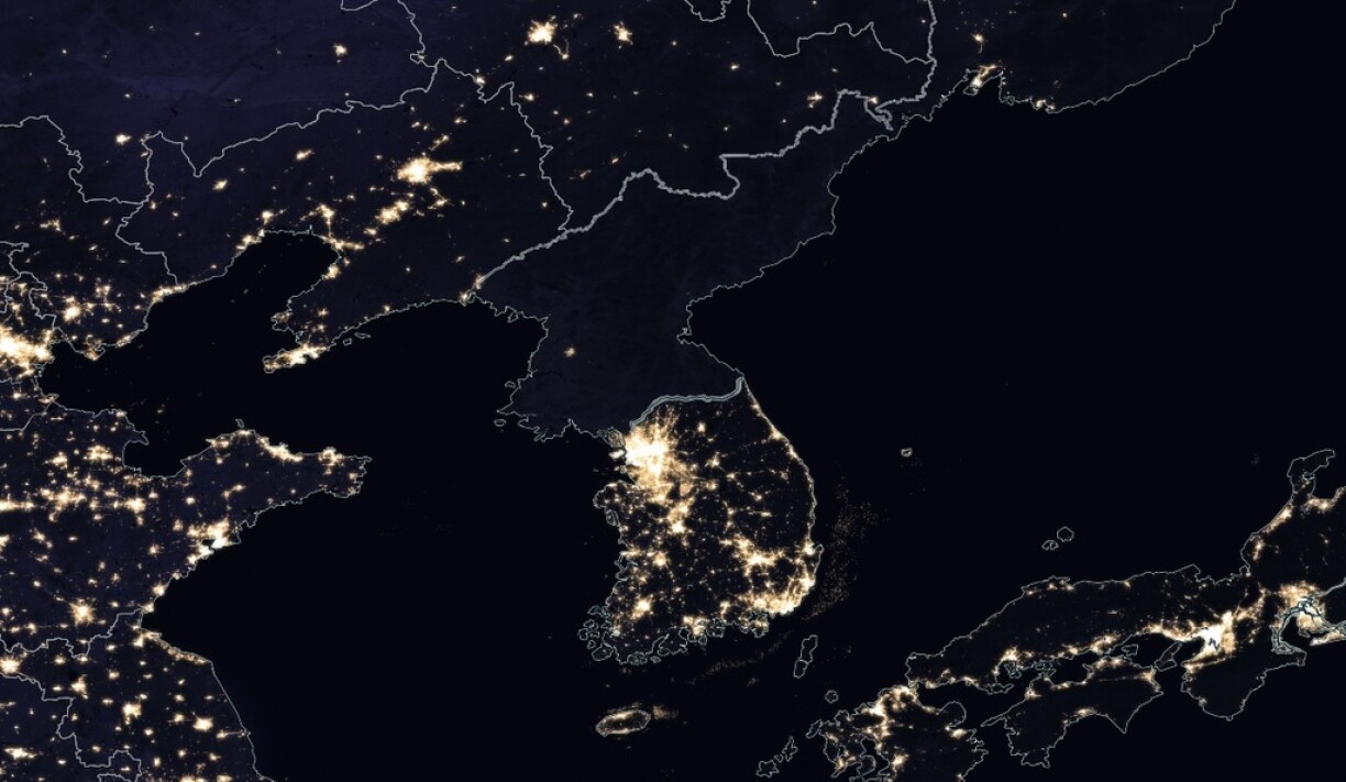 De nuit et vu du ciel, le pays prend des airs d’immense désert noir perdu entre les deux puissances voisines que sont la Chine et la Corée du Sud.