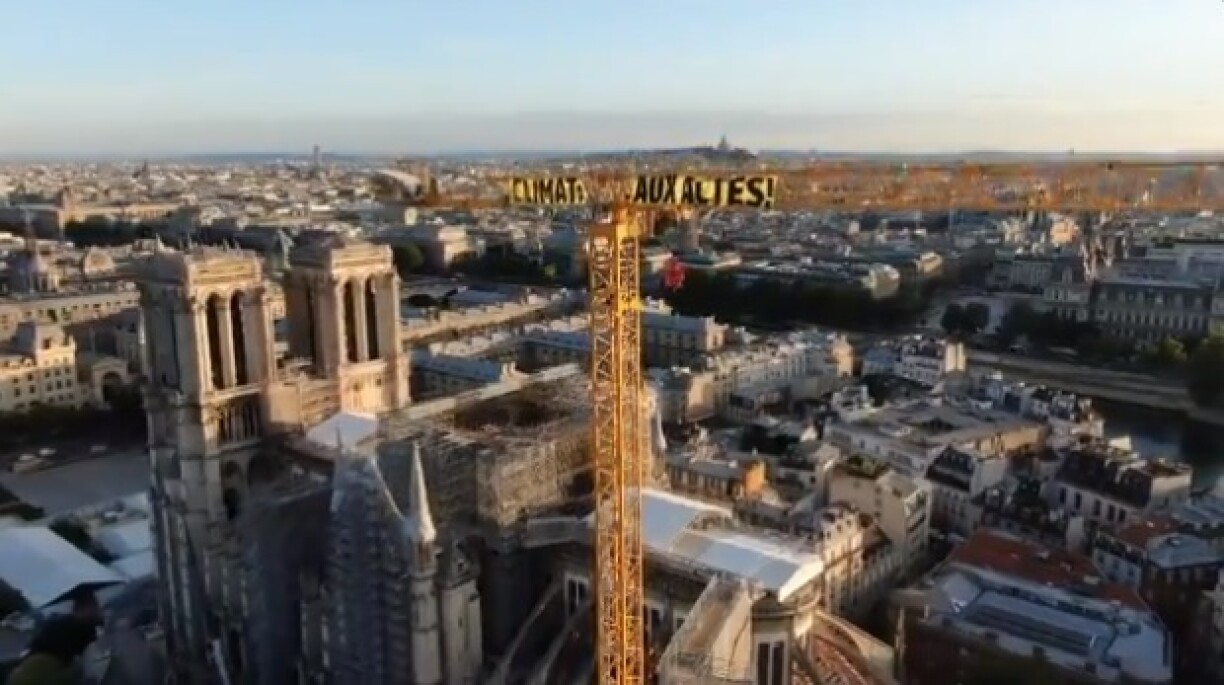 L’un des militants, suspendu dans le vide, a affiché le message “Macron, climat, Notre-Drame” sur une pancarte.