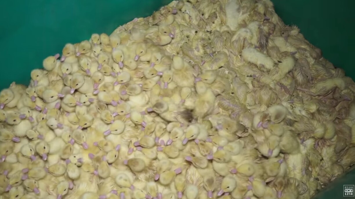 Alors que les mâles sont conservés pour être gavés, les femelles sont victimes d’un tri et écartées de la production. Elles finissent par mourir de faim ou d’asphyxie dans de grands bacs, aux côtés de leurs congénères. Certaines sont jetés avant même d’avoir éclos, et sortent de leur coquille dans des poubelles.