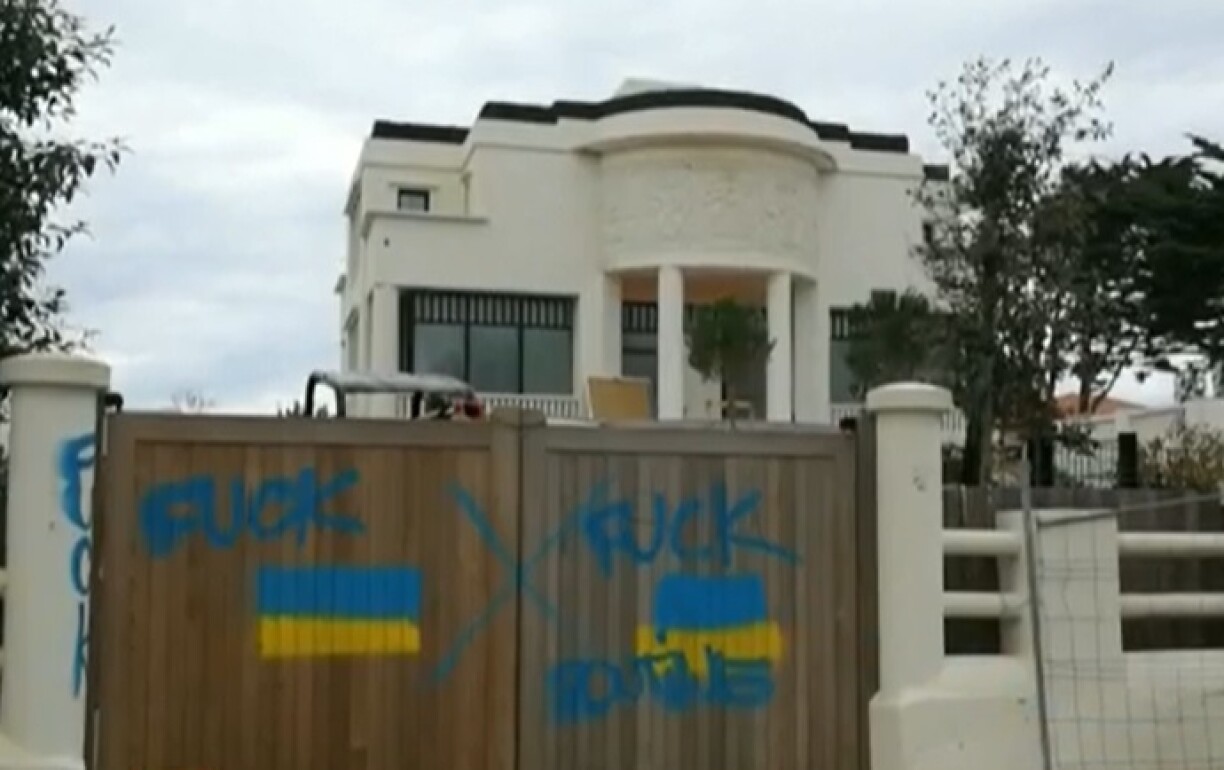 Des messages “Fuck Poutine” ont été peints à la bombe bleue sur les portails et le mur d’enceinte de cette demeure de style Art Déco, la “villa Suzanna”, bâtie face à l’océan, près de la dune. Le petit mur d’enceinte de couleur claire a été recouvert d’une multitude d’inscriptions (“fuck”), toujours peintes en bleu, et deux drapeaux ukrainiens ont été peints sur l’un des principaux portails d’entrée. Les couleurs jaune et bleu de ce drapeau se retrouvent également en d’autres endroits sur le muret entourant la propriété.