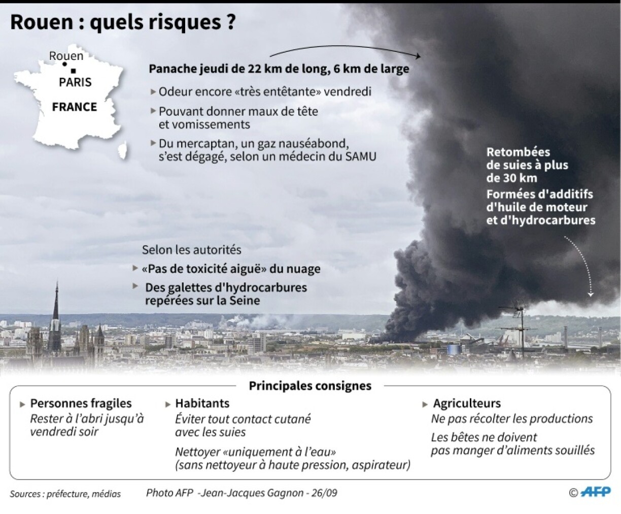 Le nuage de fumées de l’incendie de l’usine chimique Lubrizol qui a survolé les Hauts-de-France “ne présentait pas de toxicité aiguë”, selon les autorités. Mais des témoignages faisant état de suies, probablement issues du nuage noir, dans l’Aisne, l’Oise et même à Lille, ont conduit l’Agence régionale de santé des Hauts-de-France à demander aux habitants de signaler aux différents services “la présence de retombées sous forme de suie”.