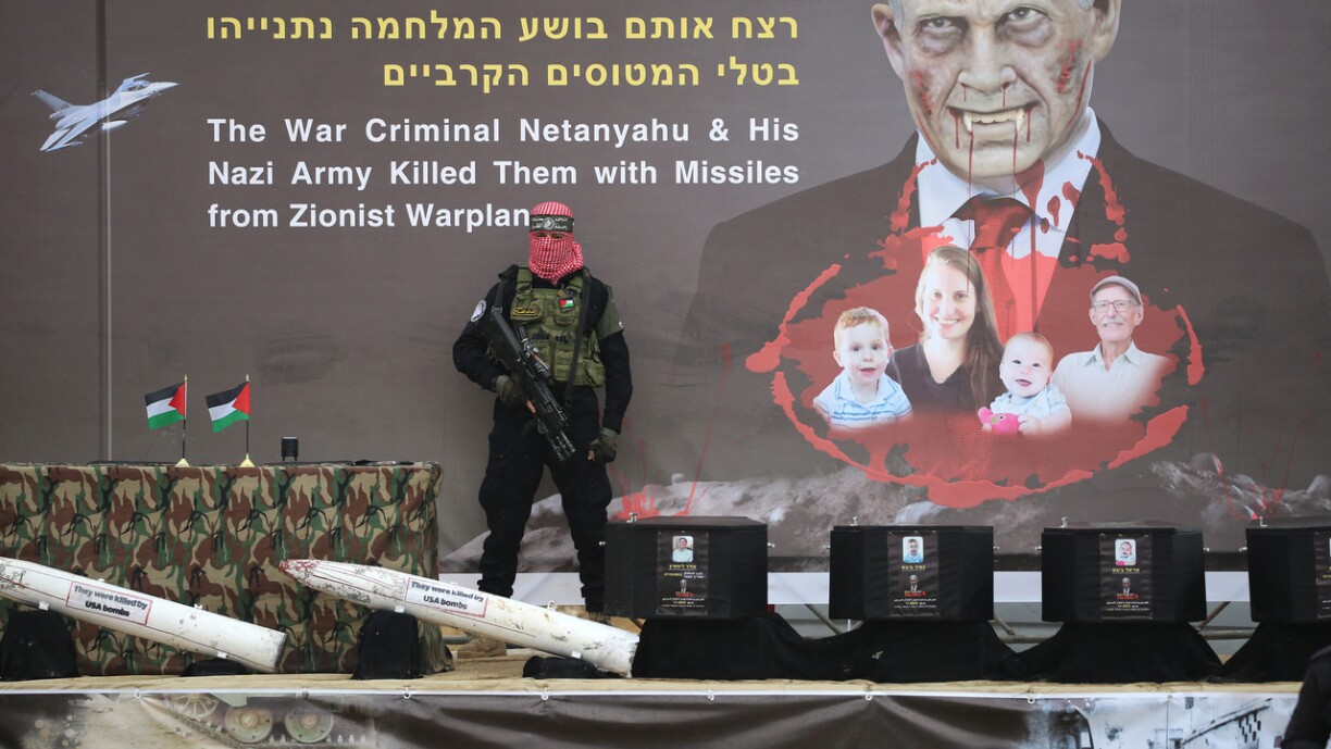 En début de matinée, des combattants cagoulés et armés du mouvement islamiste palestinien Hamas ont exposé sur une scène montée à Khan Younès, dans le sud de la bande Gaza, quatre cercueils noirs portant chacun la photo d’un des otages israéliens.