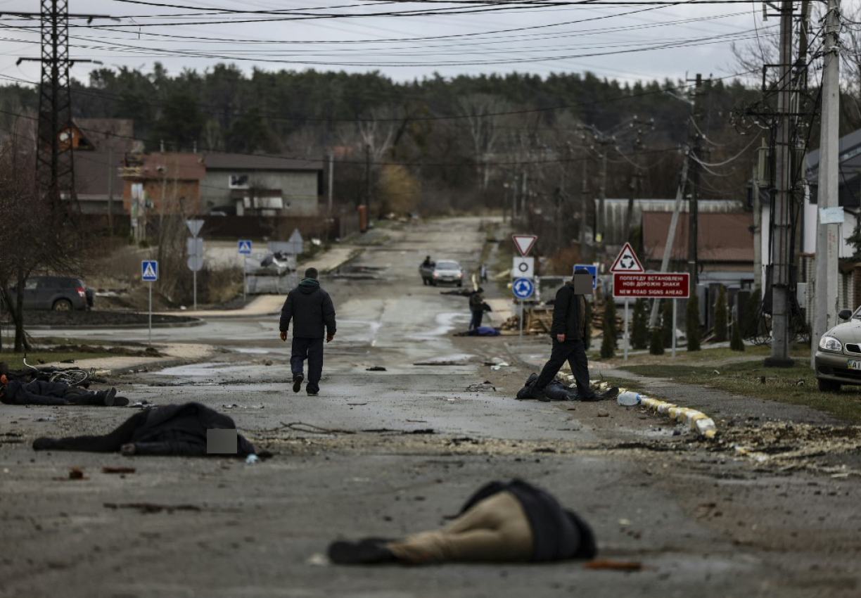 L’AFP y a vu samedi les corps sans vie d’au moins vingt hommes portant des vêtements civils gisant dans une rue de Boutcha. L’un des hommes avait les mains liées et les cadavres étaient éparpillés sur plusieurs centaines de mètres.