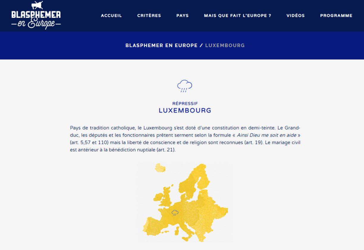 Il est à noter que le Portugal et l’Allemagne, ainsi que la Grèce, sont classés dans cette même catégorie de pays dits “répressifs”. Si le délit de blasphème n’existe plus à l’ouest de la péninsule ibérique, deux articles du code pénal portugais s’en rapprochent, liés à l’outrage aux convictions ou fonctions religieuses.