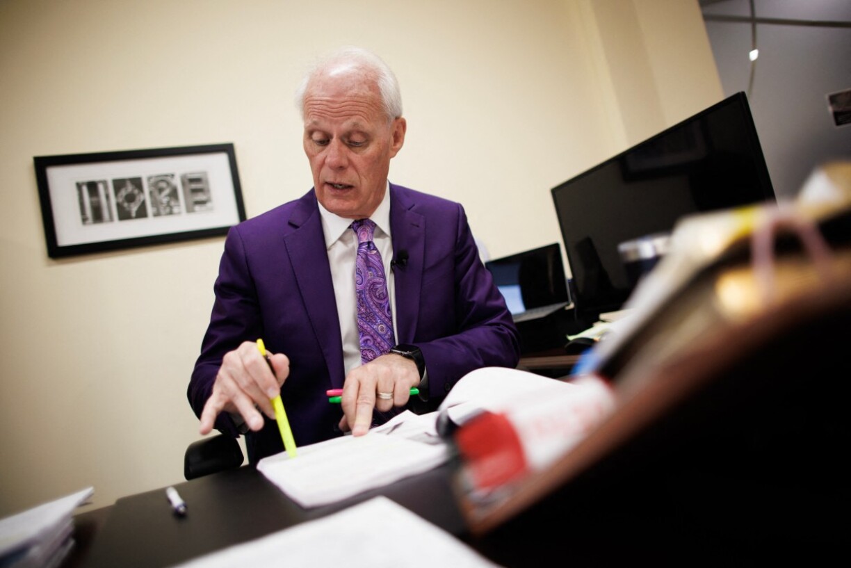 “Je dois régulièrement voyager aux États-Unis et, chaque fois, je dois obtenir une autorisation à cause de mon casier judiciaire”, dit-il, portant cravate et costume violets, chaussures noires cirées.