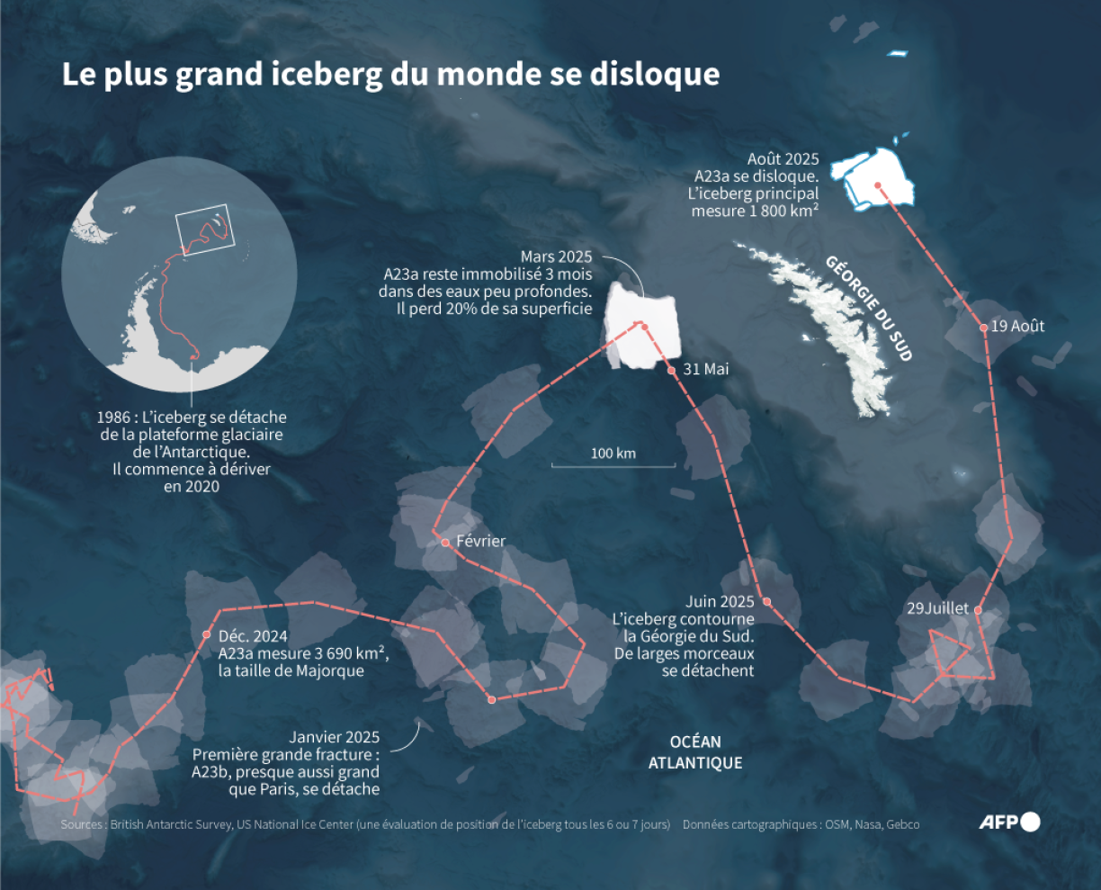 A23a s’était détaché du continent en 1986 avant de s’échouer en mer de Weddell, où il est resté ancré au plancher océanique pendant plus de trois décennies. En 2020, il s’est remis en route, porté comme d’autres icebergs par le puissant courant circumpolaire antarctique.