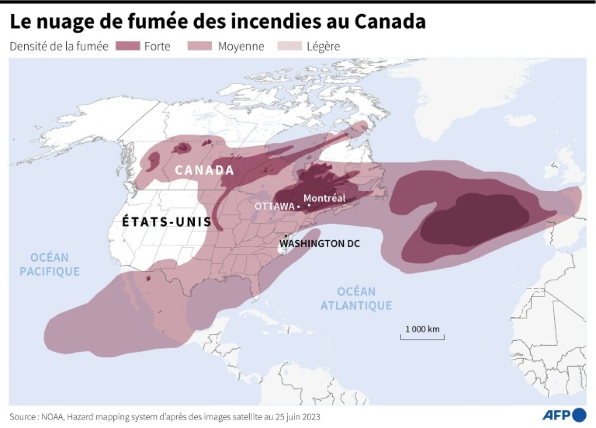 Dimanche, 81 feux de forêt étaient encore actifs au Québec, dont 27 considérés comme hors de contrôle. Une fumée âcre recouvrait Montréal, où des niveaux exceptionnels de pollution ont été atteints, entraînant l’annulation de plusieurs manifestations culturelles ou sportives.