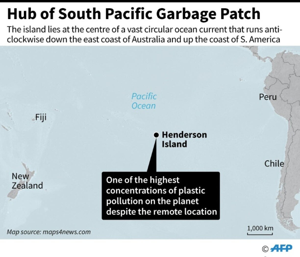L’île Henderson se trouve au centre du gyre subtropical du Pacifique Sud, un gigantesque tourbillon océanique qui tourne dans le sens inverse des aiguilles d’une monde, descendant la côte australienne pour remonter ensuite le long de l’Amérique du Sud. Ce gyre est une bénédiction pour l’atoll en ce qu’il contribue à ramener dans ses eaux les nutriments qui contribuent à la prolifération d’une riche faune marine et de colonies d’oiseaux marins.