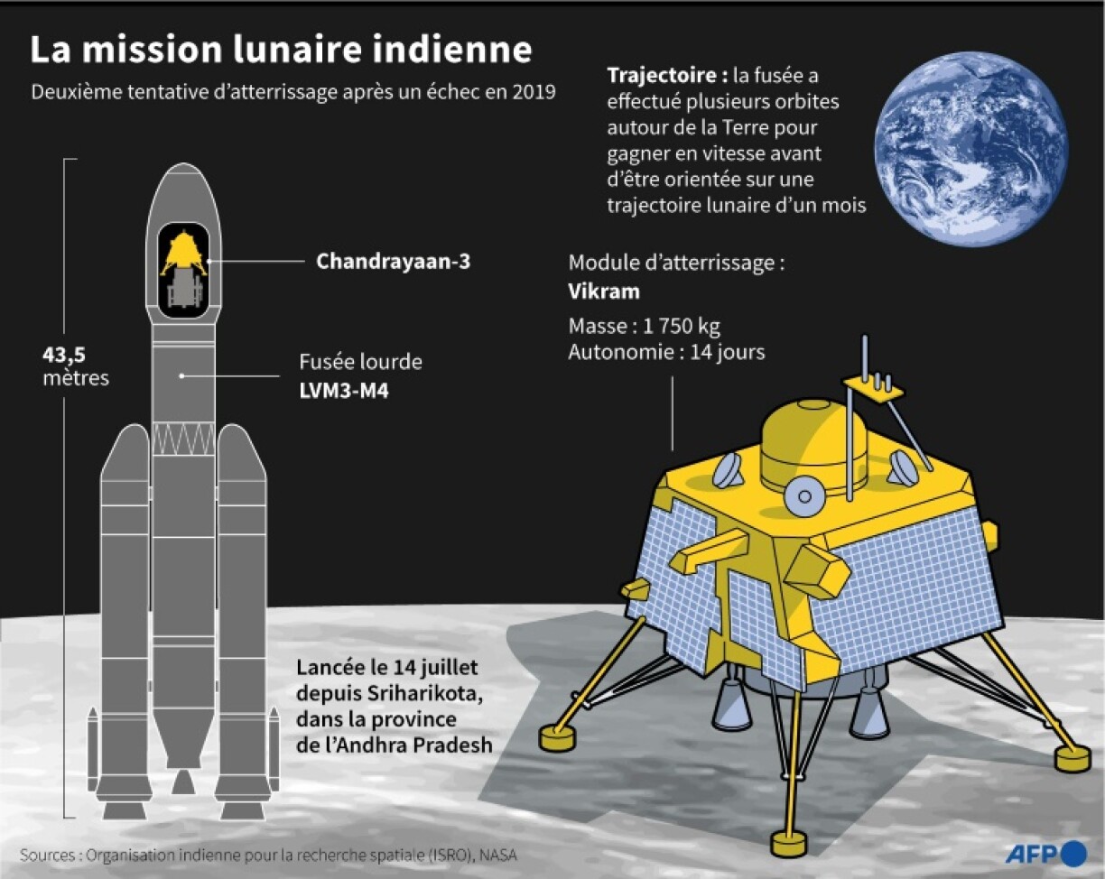 Cette nouvelle étape du programme indien, en plein essor, intervient quatre ans après un échec cuisant, l’équipe au sol ayant perdu le contact avec l’engin peu avant l’arrivée sur la Lune.