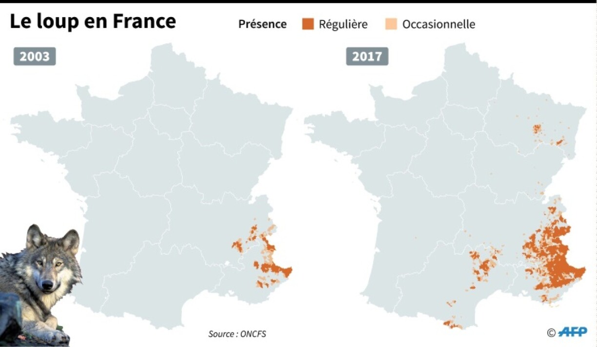En décembre 2018, l’Office national de la chasse et la faune sauvage (ONCFS) jugeait “probable que l’effectif en sortie d’hiver 2018/2019 dépasse les 500 loups”. Ce chiffre de 500 “correspond à un premier seuil de viabilité démographique” de l’espèce, avait ajouté l’Office, soulignant que cela était l’objectif figurant dans le “plan loup” du gouvernement, mais pour 2023.