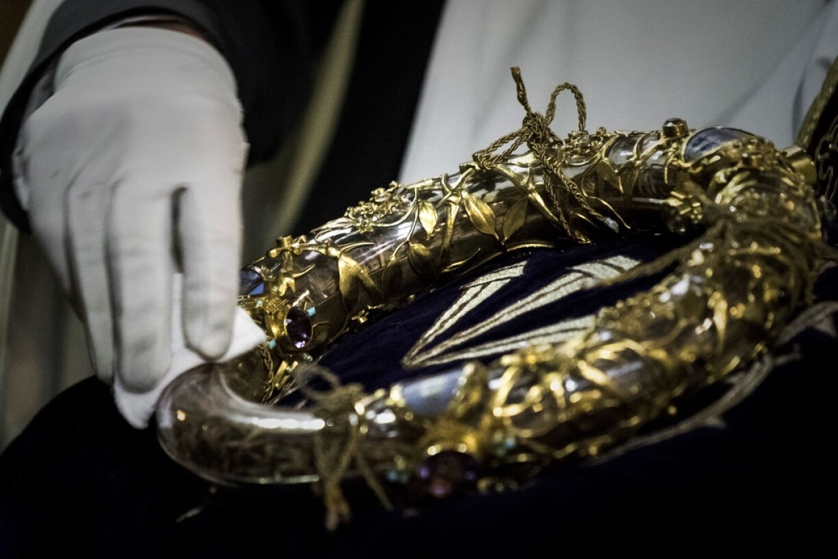 C’est le “trésor” le plus précieux qui a été sauvé à Notre-Dame: cette couronne est celle qui a été posée sur la tête de Jésus avant sa crucifixion, selon la croyance chrétienne. Elle est composée d’un “cercle de joncs réunis en faisceaux et retenus par des fils d’or, d’un diamètre de 21 centimètres, sur lequel se trouvaient les épines.”