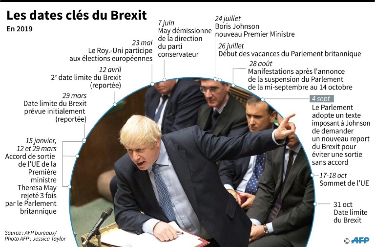 Boris Johnson s’oppose farouchement à tout nouvel ajournement du Brexit, initialement prévu pour le 29 mars et déjà reporté deux fois, si aucun compromis n’est trouvé. Il a réitéré lundi sa détermination à sortir à tout prix du club européen le 31 octobre, sous peine d’infliger un “dommage permanent” à la confiance des Britanniques envers la démocratie, après le référendum de 2016 qui a tranché à 52% pour le Brexit.