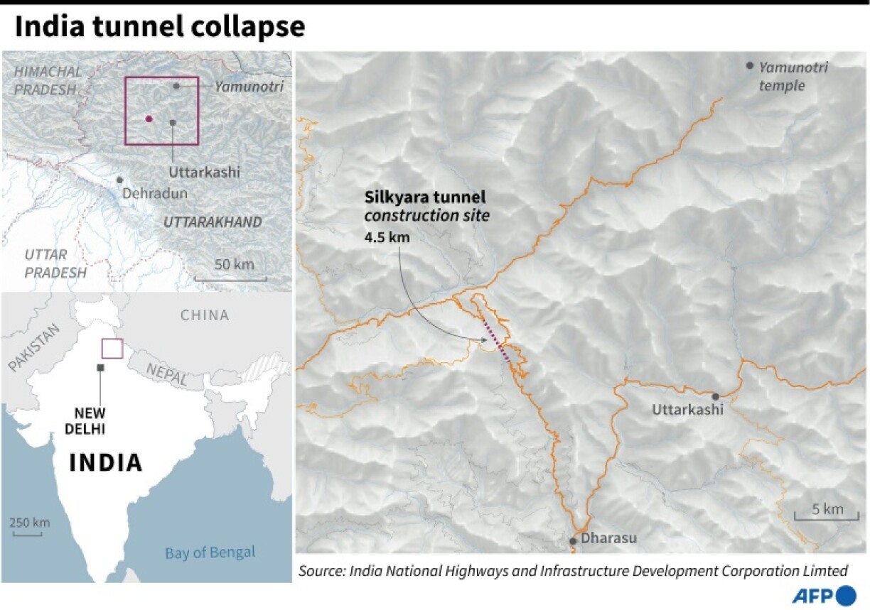 Des médias indiens ont également diffusé une photo d’un excavateur déblayant la terre sur le haut de la colline, au-dessus du tunnel.
