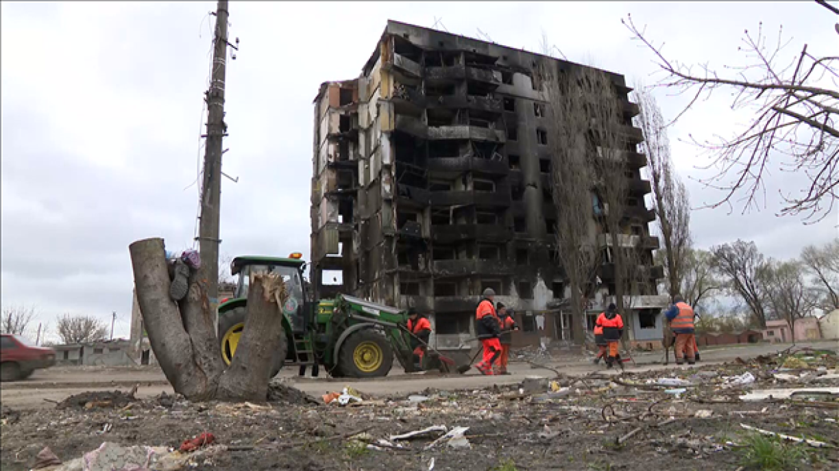 Notre équipe décide alors de quitter l’autoroute et de traverser en voiture les villes et villages occupés par l’armée russe avant son retrait. Arrivée à Borodyanka, ville martyr qui a subie une pluie de bombardements. Aujourd’hui, la ville est libérée des Russes et les employés communaux s’activent derrière un immeuble calciné.