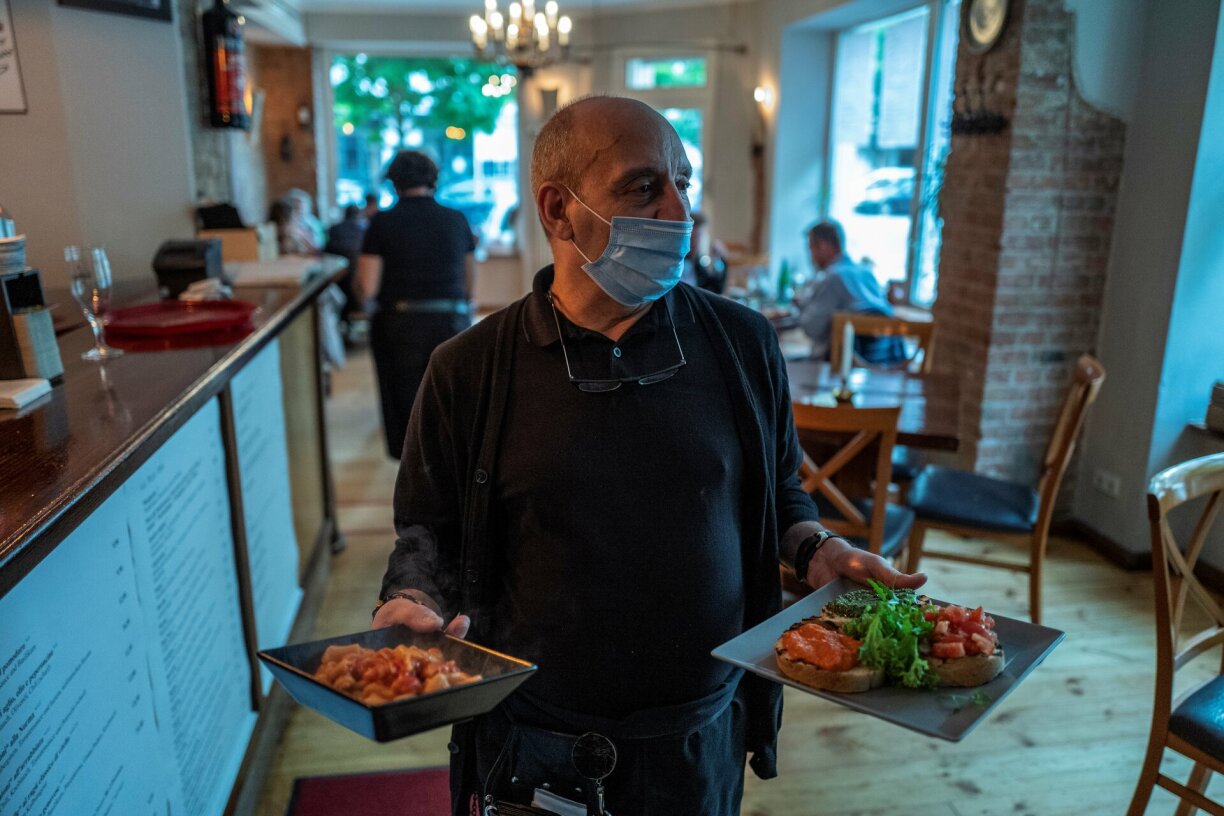 En Albanie, outre le désinfectant pour les mains en libre-service, les employés des restaurants et des bars portent des gants et des masques et les tables, qui doivent être espacées de trois mètres, ne peuvent chacune accueillir plus de deux personnes.