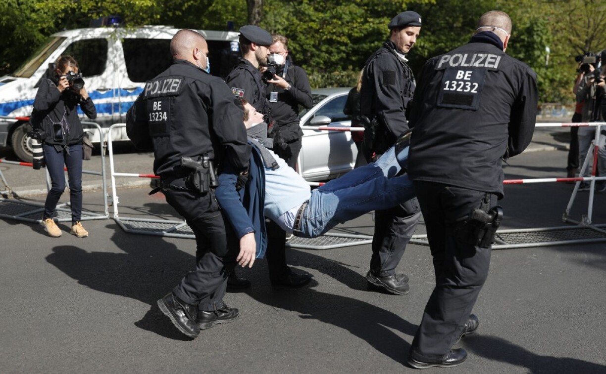 Plusieurs dizaines de manifestants ont ainsi tenté de se rassembler, comme ils le font chaque semaine depuis mars, devant la mythique théâtre de la Volksbühne, en plein centre de Berlin, mais l’accès a été bloqué par les forces de l’ordre, a constaté un journaliste de l’AFP.