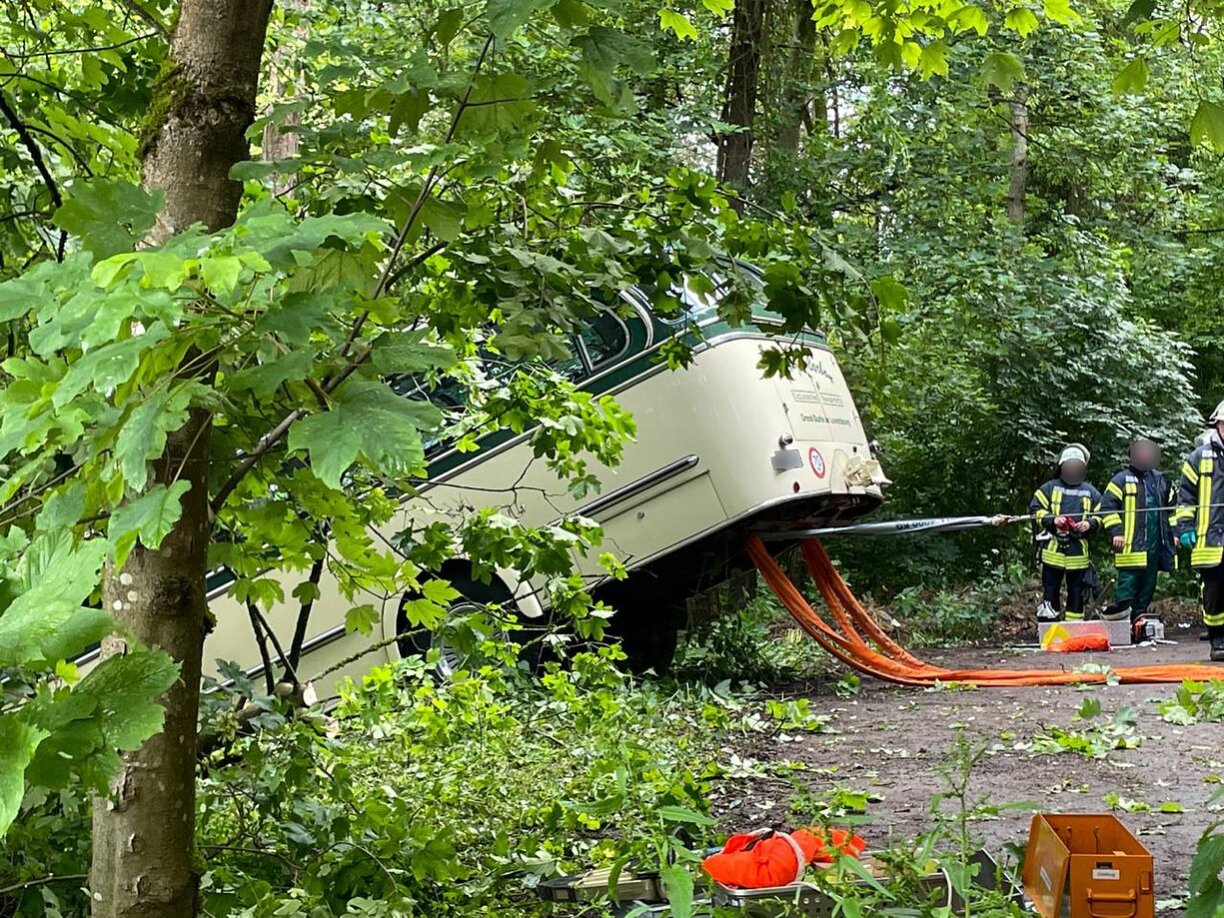 Le porte-parole des pompiers locaux a déclaré dans une interview au Blaulichtreport Saarland que le bus de collection a dévalé un talus, vers 16h. Une personne s’est retrouvée coincée entre le bus et un arbre.
