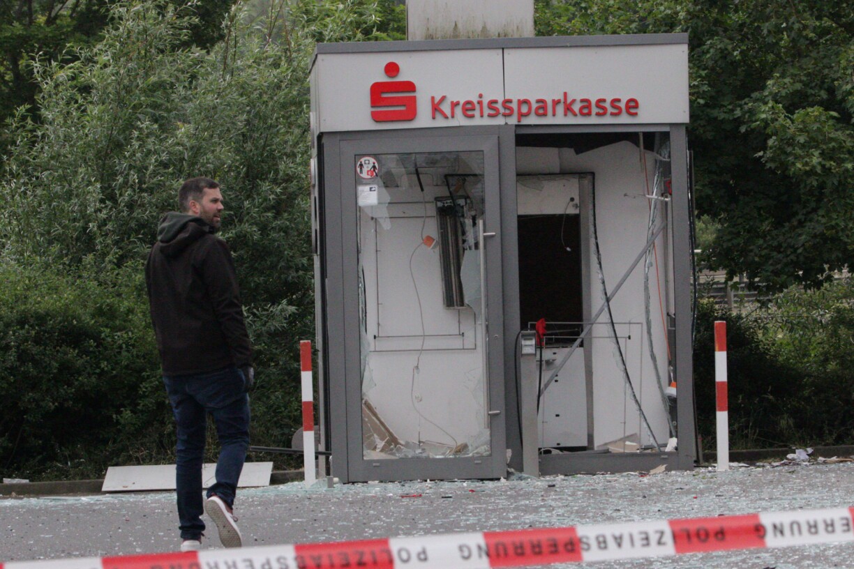 Le distributeur de la Kreissparkasse qui a volé en éclat est esseulé sur le parking du supermarché Norma situé rue de Bitburg à Echternacherbrück.
