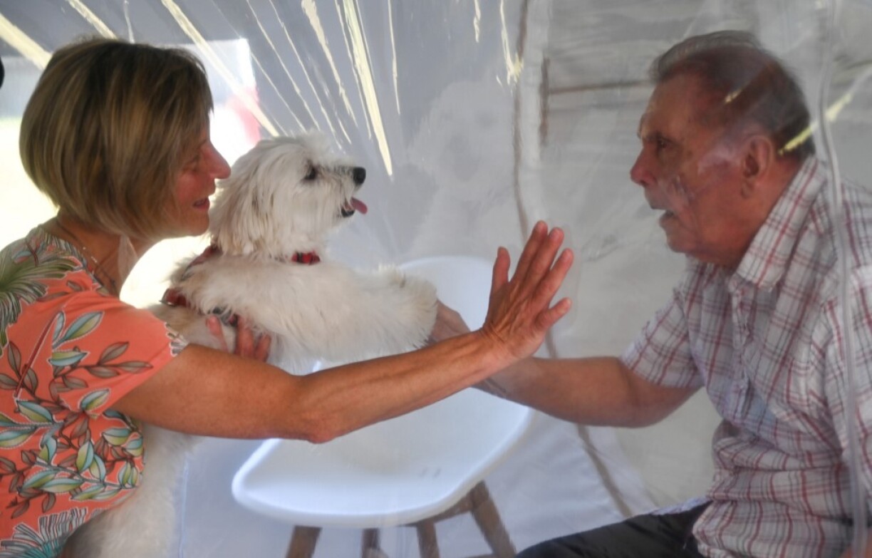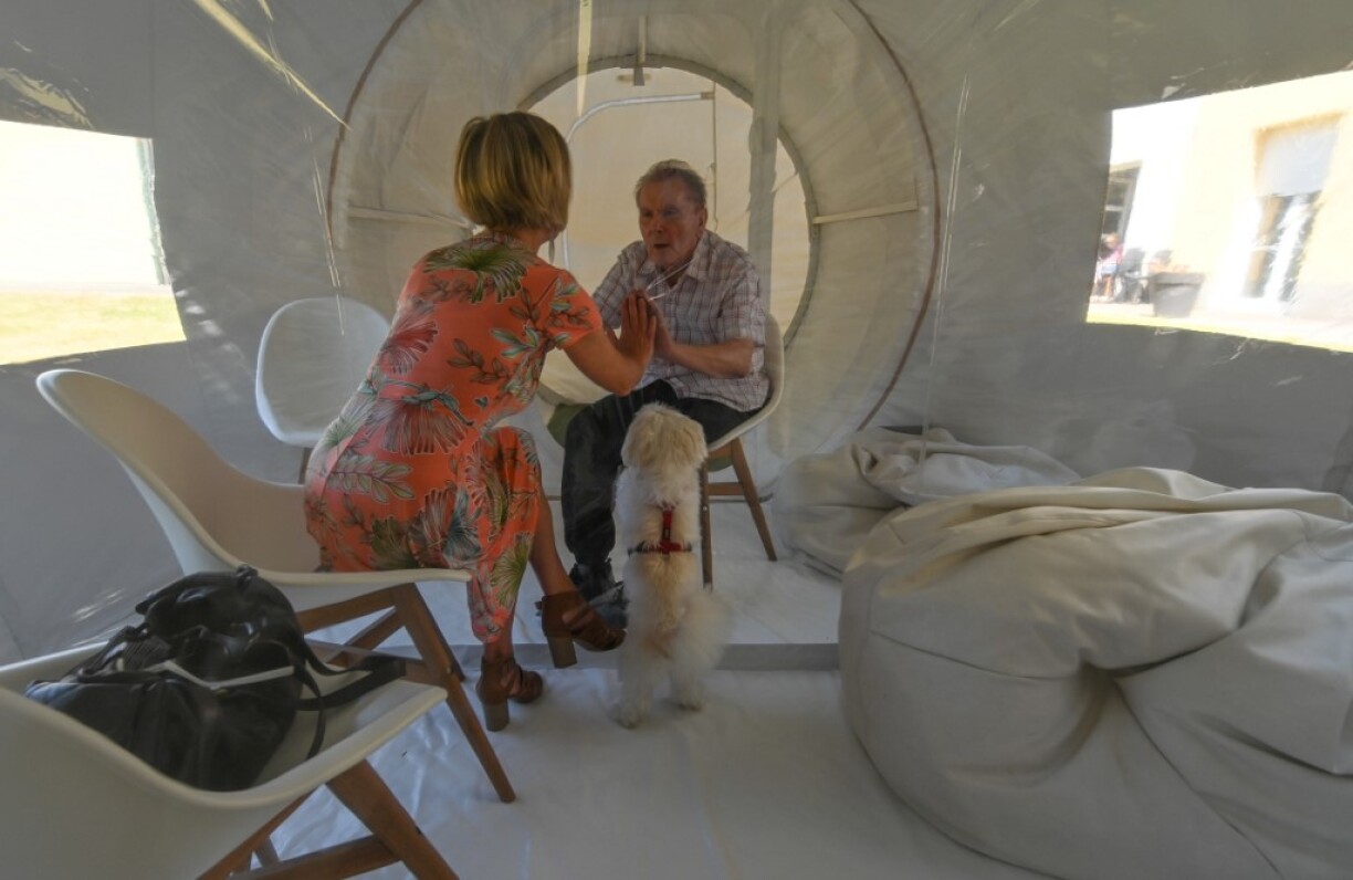 Mais “les gens ne s’entendaient pas, beaucoup se fâchaient. Aujourd’hui, avec cette bulle qui répercute les sons vers l’intérieur, ils se parlent, se voient sans masque et se touchent presque”, se réjouit Audrey qui a vu, émue, un couple s’embrasser à travers la paroi.