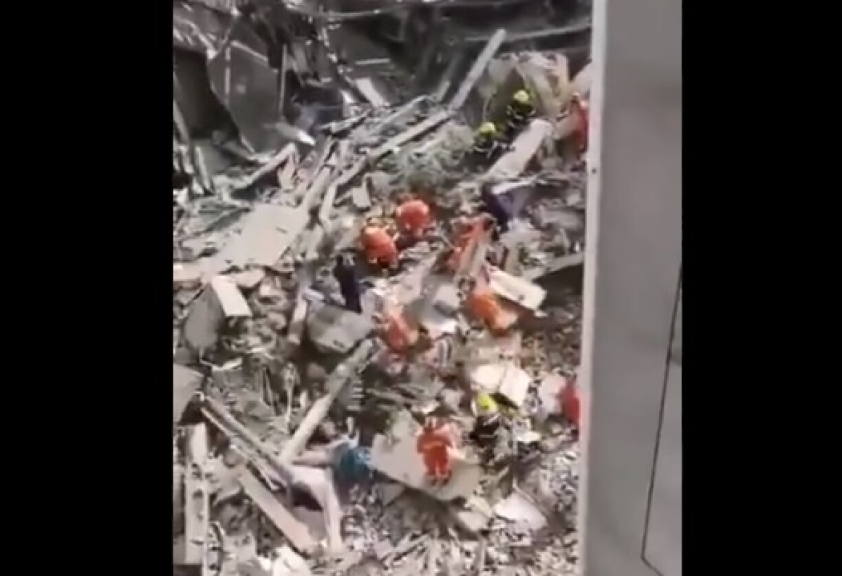 Des images diffusées par CCTV montrent des dizaines de secouristes en combinaison orange, coiffés de casques et affairés à côté d’une montagne de décombres.