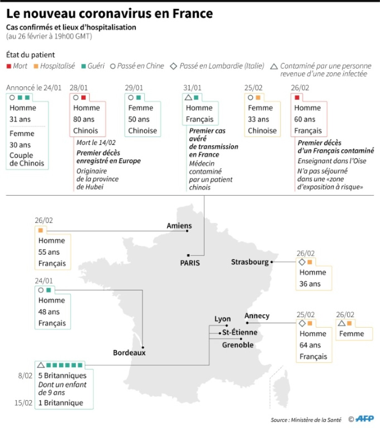 Pour l’heure, le bilan de la maladie Covid-19 en France est de deux morts (le Français de 60 ans dont le décès a été annoncé mercredi et un touriste chinois de 80 ans), douze guérisons et quatre malades hospitalisés.