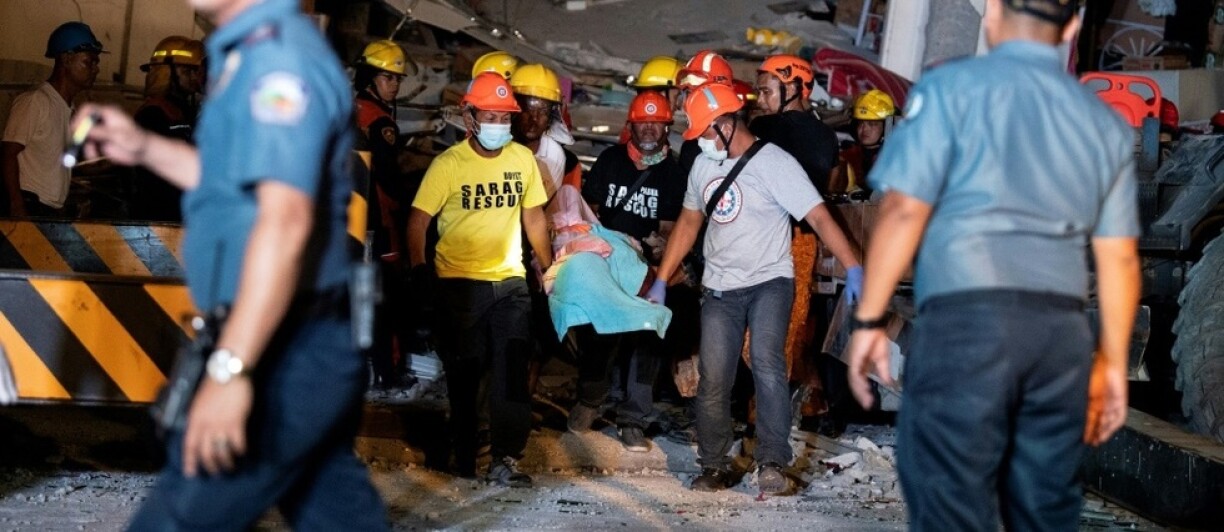 Une course contre la montre était lancée à Porac, à une centaine de km au nord-ouest de Manille, sur l’île de Luçon, pour déblayer, avec des engins de chantier et des marteaux-piqueurs, les ruines d’un bâtiment effondré de quatre étages dans lequel une trentaine de personnes pourraient être coincées.