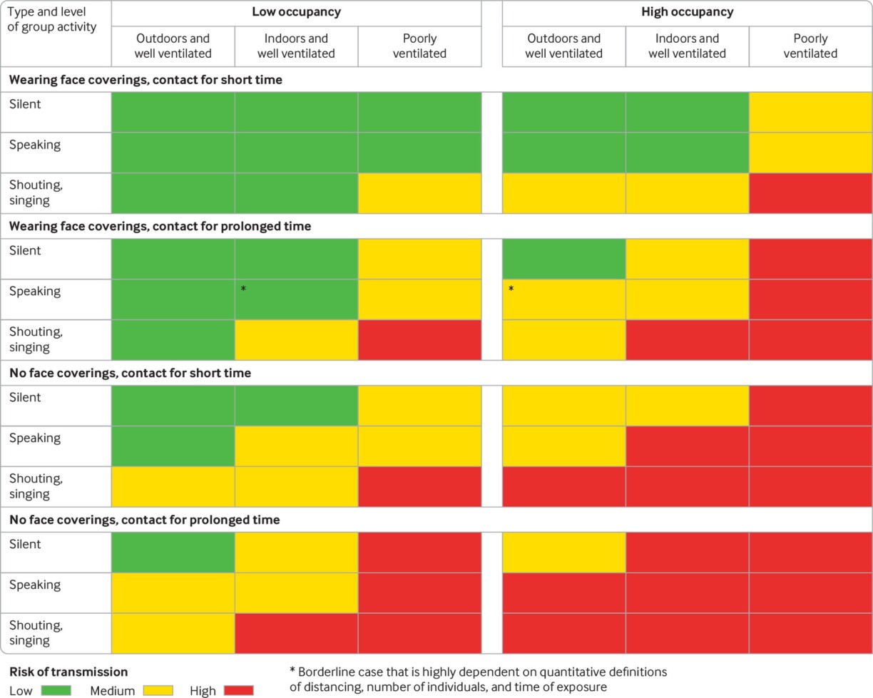En fonction du nombre de personnes, de la durée et de la nature de l’activité, ainsi que de sa tenue dans un espace bien ou mal aéré, le risque de transmission du virus peut varier.