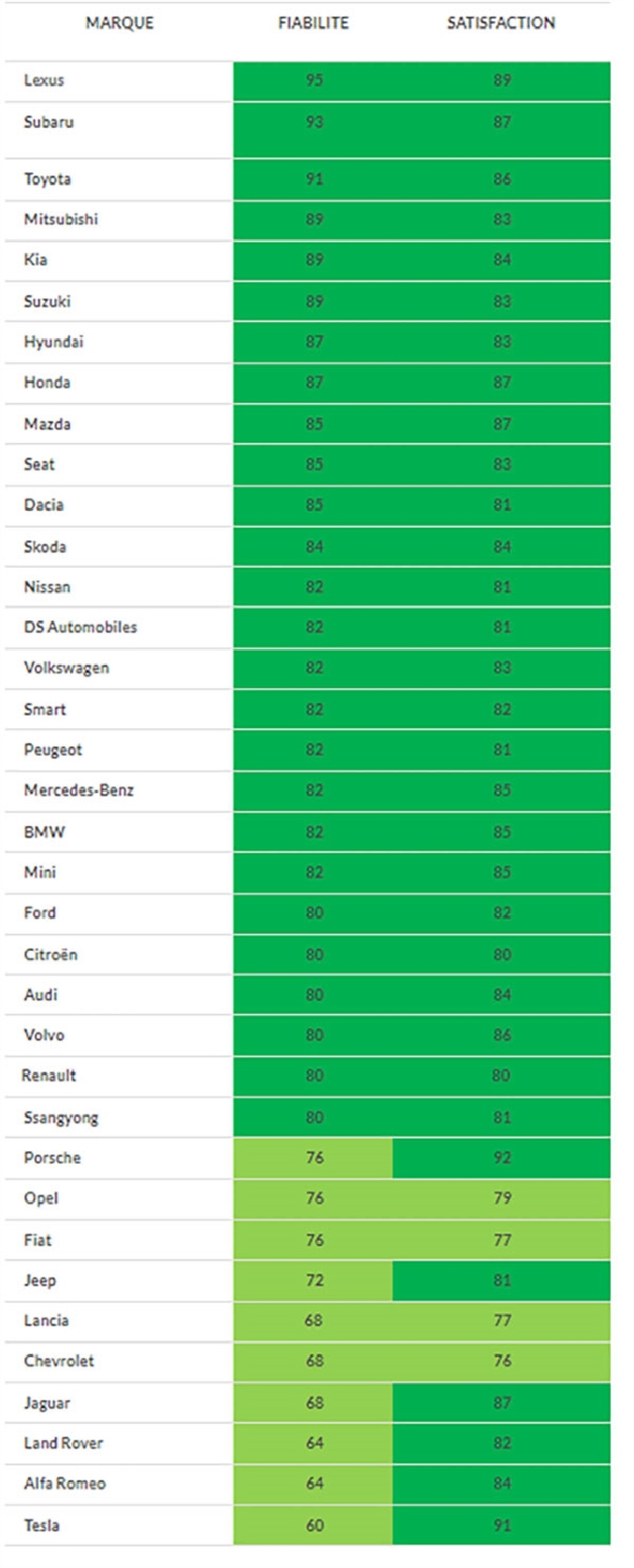 À l’inverse, la marque de voiture qui présente le moins de problèmes est Lexus, suivi par quasiment toutes les voitures asiatiques: