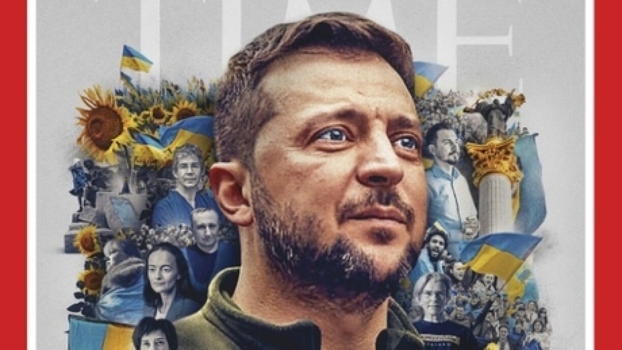En couverture du magazine, le visage du président de l’Ukraine, 44 ans, barbe de plusieurs jours et pull kaki, des symboles de son habileté médiatique, apparaît entouré de figures de la société civile. Tous surmontent une foule de manifestants portant des drapeaux du pays, bleu et jaune.