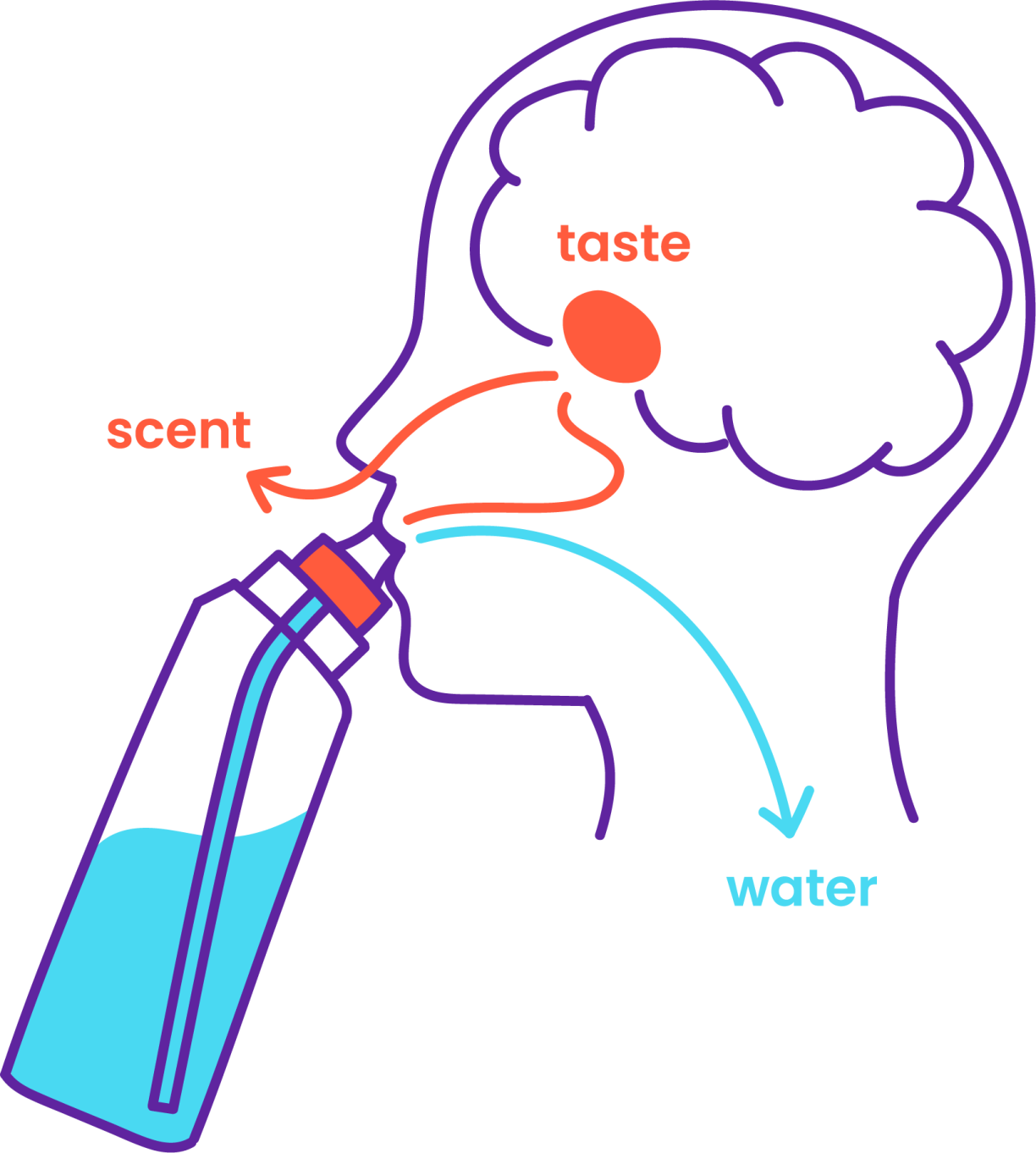 “Les bulles d’air parfumées montent jusqu’à notre centre olfactif situé à l’arrière de notre nez. Ce processus se produit naturellement aussi lorsque vous mangez ou buvez - les arômes sont extraits dans votre bouche et voyagent jusqu’à votre centre olfactif, où ils sont perçus comme un goût. De cette façon, votre cerveau ne peut pas faire la différence entre l’odeur et le goût et le transmet simplement comme une saveur” détaille la conceptrice de la gourde.