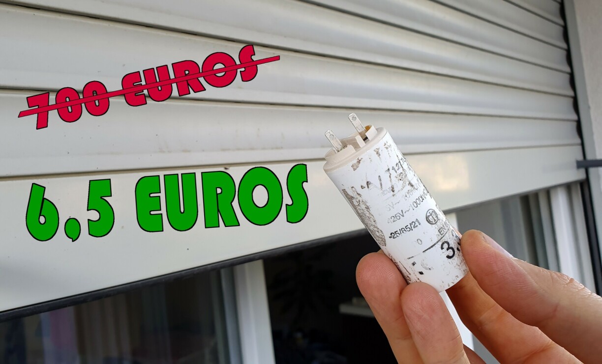 Le coupable s’appelle un “condensateur” m’explique-t-il. Son rôle, si j’ai bien compris, est d’emmagasiner de l’électricité pour faciliter le fonctionnement du moteur, en gros comme un “boost” (mes excuses aux pros). Ce que j’ai bien compris par contre, c’est que ce condensateur est le meilleur ami des vendeurs de volets et des “artisans” comme vous.