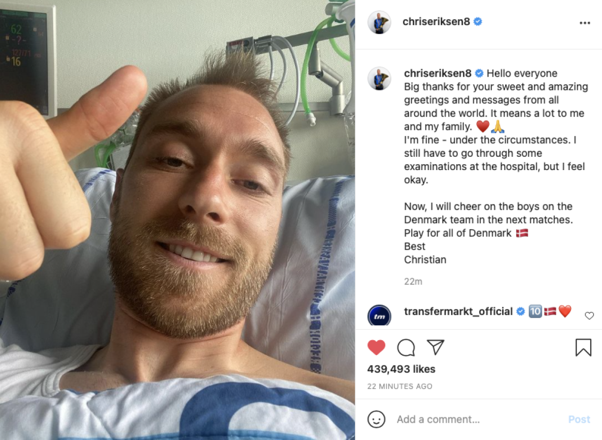 Les images de l’arrêt cardiaque de Christian Eriksen en plein match ont fait le tour du monde plongeant tous les fans de football dans l’angoisse concernant l’état de santé du joueur. Mardi matin, le joueur a donné de ses nouvelles depuis son lit d’hôpital en publiant une photo et un message adressé à tous ceux qui lui ont envoyé des messages de support depuis son malaise.