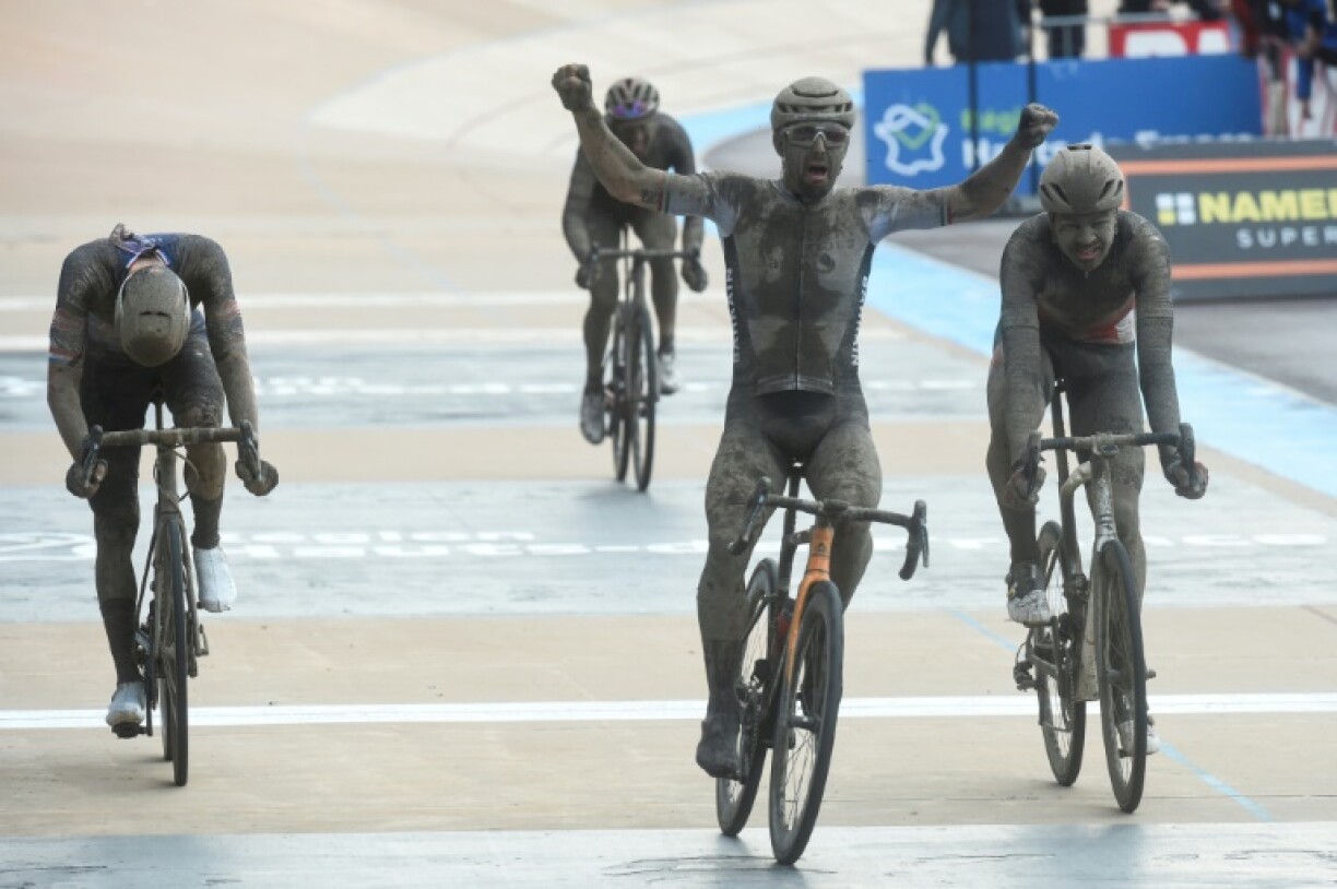 Colbrelli (Bahrain) a battu au sprint sur le vélodrome de Roubaix ses deux derniers compagnons, le Belge Florian Vermeersch et le Néerlandais Mathieu van der Poel, avant de s’effrondrer, hurlant sa joie, sur la pelouse.