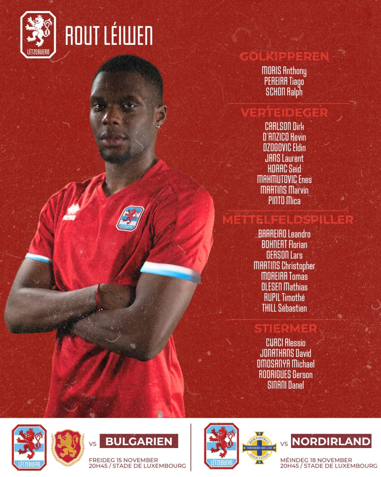 Deux nouveaux venus figurent dans la sélection. Il s’agit de Lars Gerson et de David Jonathans. L’équipe nationale luxembourgeoise jouera le 15 novembre à domicile contre la Bulgarie. Trois jours plus tard, c’est le leader du groupe, l’Irlande du Nord, que les Lions Rouges affronteront au Stade de Luxembourg. Des billets sont encore en vente.