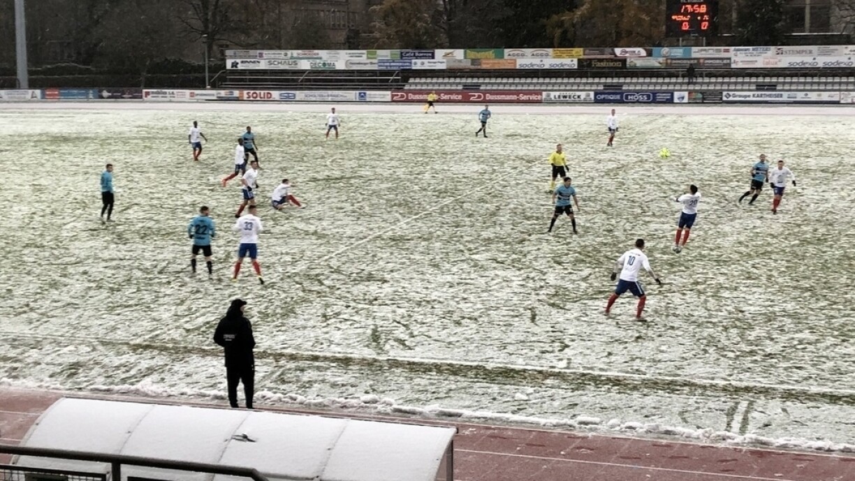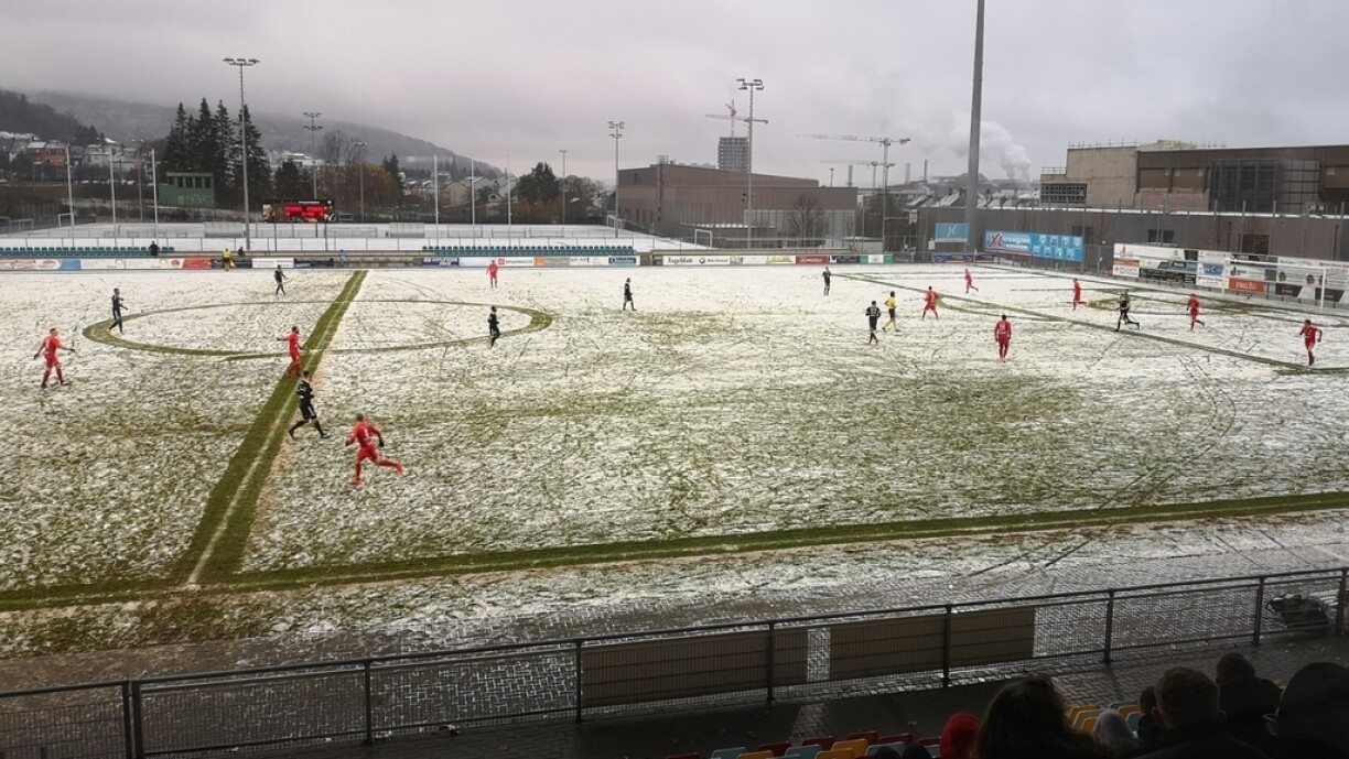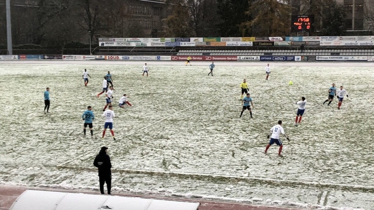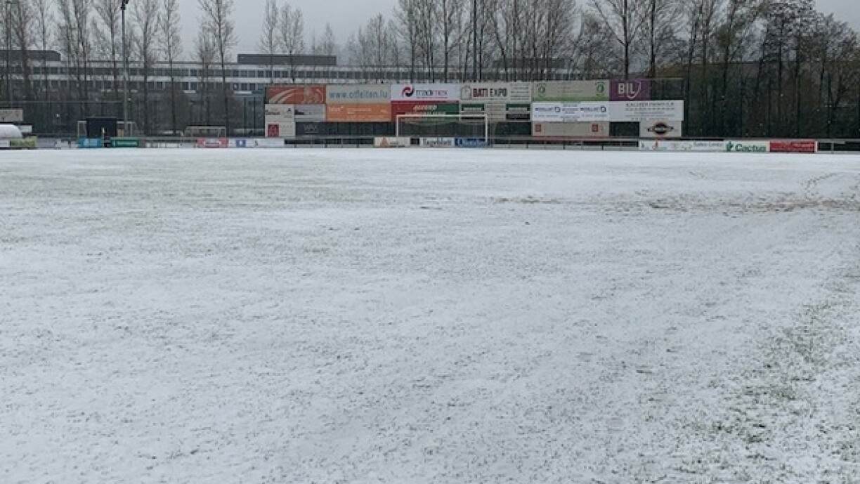 La suite de la 13e journée de jeu dans le cadre de la Ligue BGL s’est déroulée sous la neige ce dimanche après deux annulations à cause des conditions météorologiques. Une heure avant de début de la partie entre Pétange et Niederkorn, les responsables ont annoncé que le match ne pourrait pas être joué à cause de la neige qui recouvre le terrain.