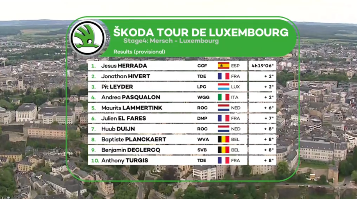 Jesus Herrada a donc attaqué en fin d’étape dans la côte qui relie Mühlenbach au Limpertsberg. Il remporte cette étape finale devant Jonathan Hivert. L’équipe Cofidis remporte donc quatre étapes sur cinq dans cette édition du Tour de Luxembourg.