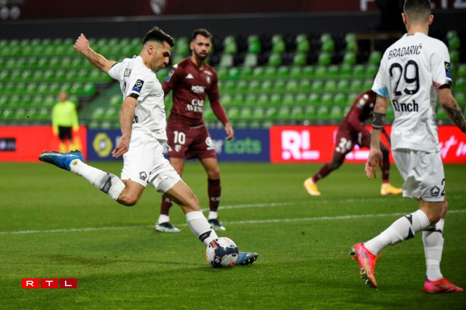 Entreprenants et inspirés dans les phases offensives, les Grenats ont également varié les combinaison sur corner. L’un d’eux a profité à Centonze, qui a décoché une grosse frappe rasant le poteau lillois (28e).