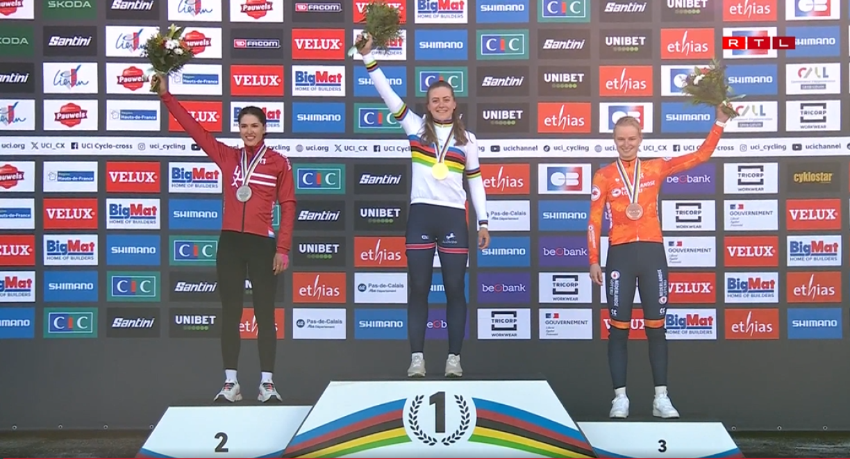 “C’est difficile de répondre à chaud avec une telle agitation. J’étais dans ma course. Je suis très contente même si certaines personnes diront que je suis seulement deuxième. J’ai enfin ma médaille. Je n’ai pas grand-chose à ajouter. Les dernières années, je la voulais déjà. Mon but, c’était le podium. Je suis donc contente que ça fonctionne aujourd’hui. Enfin! Il n’était pas possible de faire plus que la deuxième place aujourd’hui. Pendant toute la saison, je n’ai pas connu de problème de pédale au départ. Mais voilà, ça a dû se passer aujourd’hui. Mais je n’étais pas stressée, parce qu’il n’y avait pas trop de partantes. Les deux dernières semaines, je n’étais non plus partie tout devant. Je ne me suis donc pas mise de pression à cause d’un départ raté. Dans le premier tour je suis vite revenue. Il s’agissait de faire une reconnaissance, parce que je me suis rendue compte ce matin que le terrain avait déjà bougé. Je me suis dit que c’était super gelé! C’était évident qu’il fallait s’attendre à des fautes dans le premier tour. De tout le monde, parce que tout le monde était nerveux. J’ai vite trouvé mon rythme. Il y a eu certes quelques ratés (fautes techniques), mais à partir du deuxième tour, j’ai réussi à trouver mes repères. Sans stress. Je n’aurais pas pu faire beaucoup mieux.J’ai changé à chaque passage de zone mon vélo. Mais il est vrai que lors du premier changement, j’ai déjà demandé à mes mécanos d’avoir un peu moins de pression dans les pneus.”