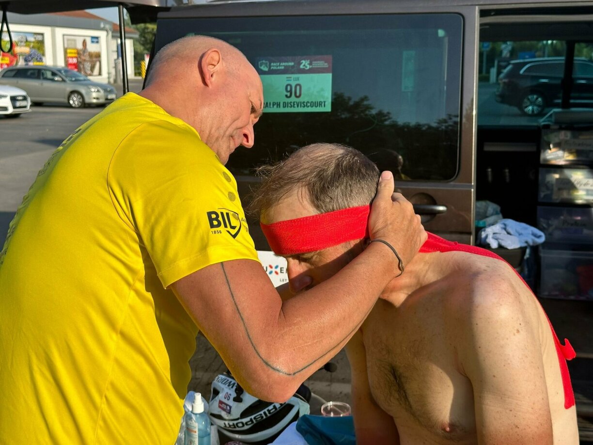 Depuis mercredi, le cycliste luxembourgeois Ralph Diseviscourt a dû faire face à des problèmes de nuque qui se sont aggravés dans la nuit de mercredi à jeudi. Malgré avoir essayé diverses solutions comme des massages, des bandes de kinésiologie et une modification spéciale sur son vélo pour soutenir sa nuque pendant l’effort, ses douleurs persistaient.